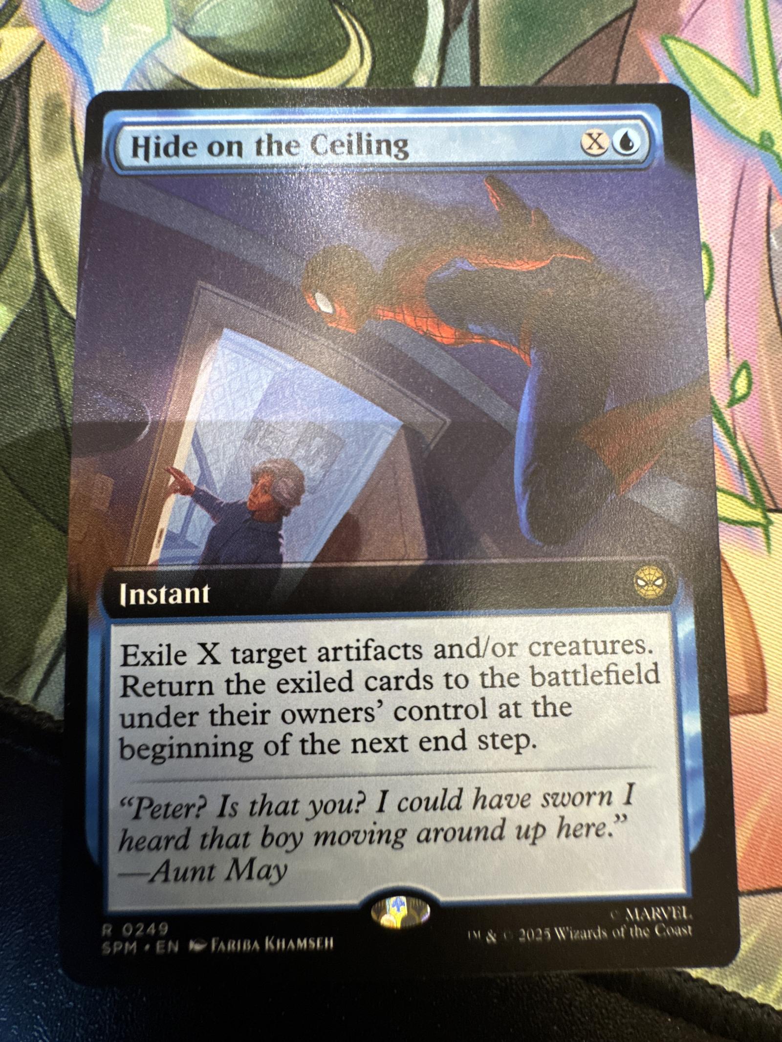 Hide on the Ceiling is a rare instant card from the Marvel Secret Lair set, illustrated by Fariba Khamseh. The card exiles X target artifacts and/or creatures, returning them at the next end step. Played in casual and some niche formats, it also features thematic Spider-Man flavor text from Aunt May. This is a normal printing English language card, numbered 249 in the set.