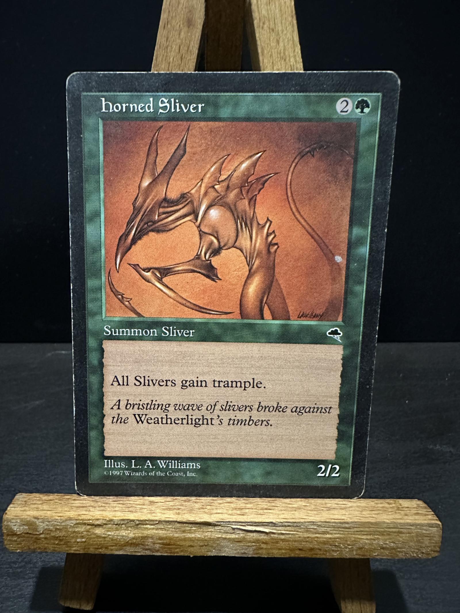 Horned Sliver from the Alpha set, illustrated by L.A. Williams. This card grants all Slivers trample and is a collectible piece from the original Magic the Gathering printings. Not foil.