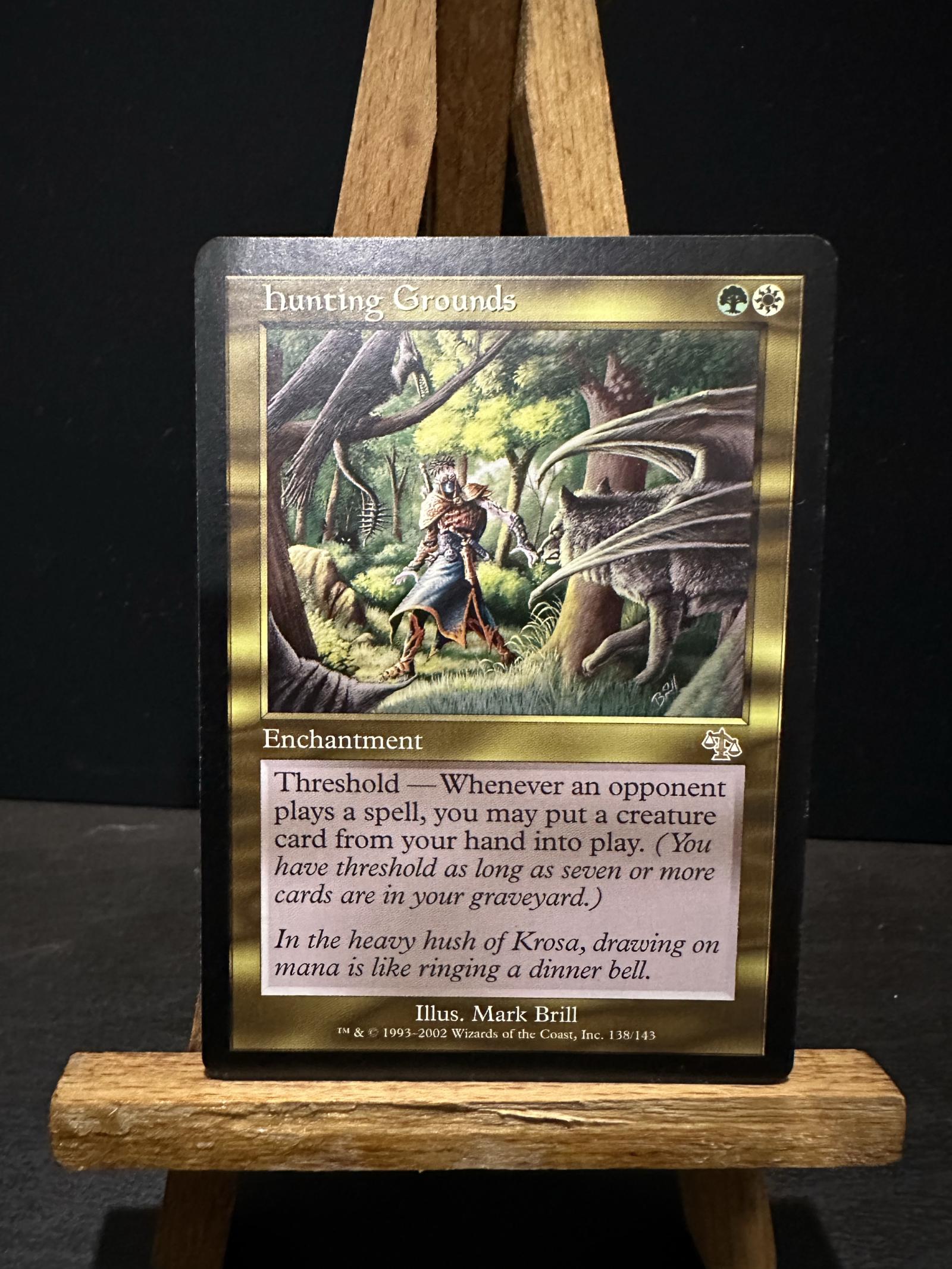 Hunting Grounds is an enchantment card from the Onslaught set, illustrated by Mark Brill. It features the Threshold mechanic, allowing you to put a creature card from your hand into play whenever an opponent plays a spell, given you have seven or more cards in your graveyard. This is a non-foil collectible card playable in formats supporting Onslaught cards.