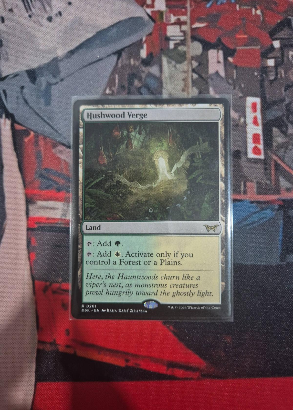 Hushwood Verge is a land card from the Magic: The Gathering set Outlaws of Thunder Junction Commander (set code DSK). Illustrated by Kasia 'Kafis' Zielinska, this card provides green mana and conditional white mana if you control a Forest or Plains. This is a regular (non-foil) version. Hushwood Verge is valuable in Commander and other casual formats for mana fixing, though it is primarily collectible and not a meta staple. The card is in English and is numbered 261 in its set.