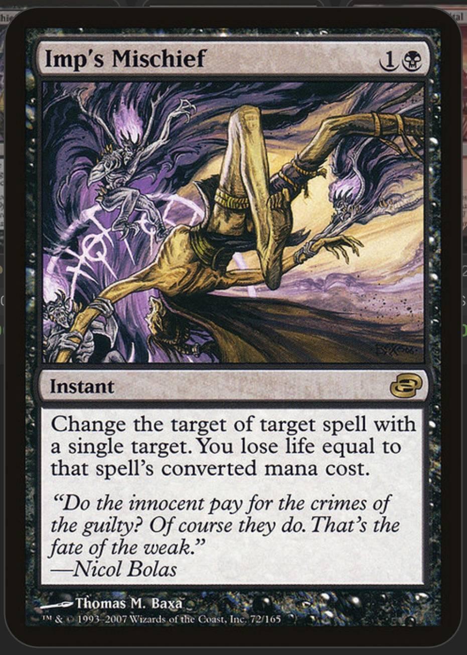 Imp's Mischief is an instant card from the Magic The Gathering set with card number 72/165. The artist is Thomas M. Baxa. This card allows you to change the target of a single target spell, at the cost of life equal to the spell’s converted mana cost. Playable in casual decks, it has strategic use in target manipulation. The card is printed normally, not foil.