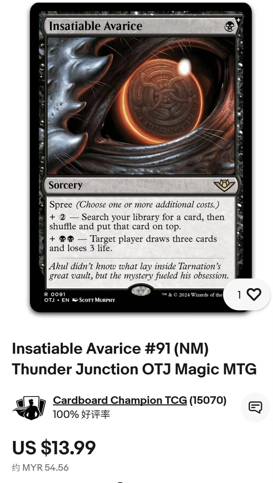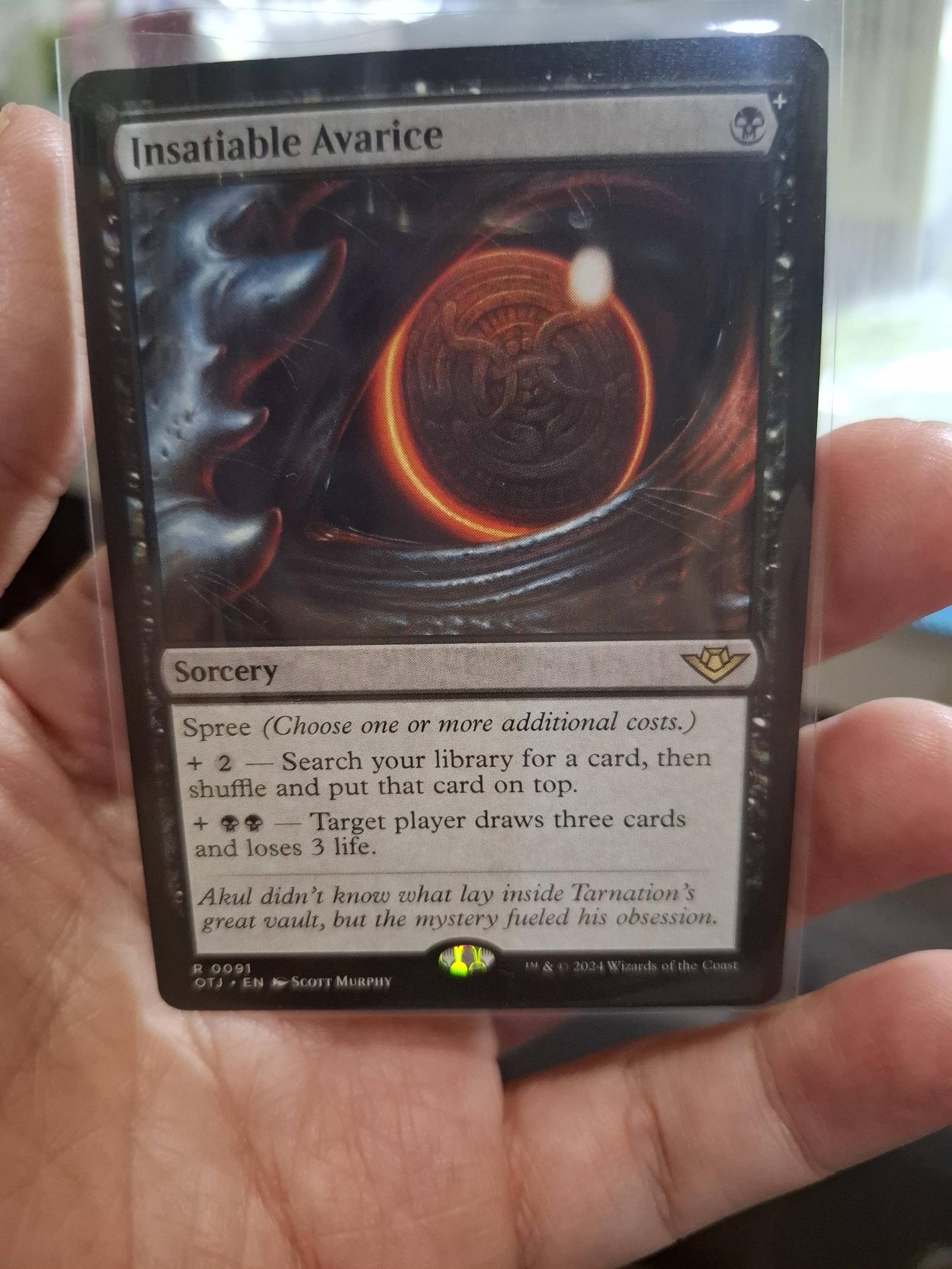 Insatiable Avarice from the One True Yearning (OTY) set, illustrated by Scott Murphy. This is a foil extended art black sorcery card. Playable in various black control or combo decks in the current Magic meta. The card allows searching your library or drawing cards with a life loss mechanic. Collector number 91, English language.