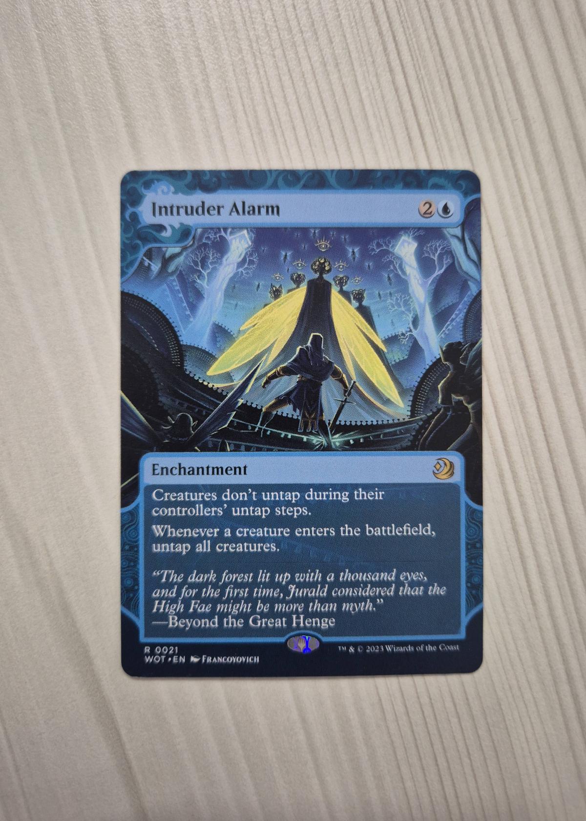 Intruder Alarm is a rare blue enchantment from the Wilds of Eldraine: Enchanting Tales set, illustrated by Francoyovich. The card reads: "Creatures don't untap during their controllers' untap steps. Whenever a creature enters the battlefield, untap all creatures." This particular copy has the set code WOT, card number 21, and is in English (EN). The card is printed with a normal (non-foil) treatment. Intruder Alarm is beloved for its combo potential in Commander and other formats, making it both a powerful and collectible card.