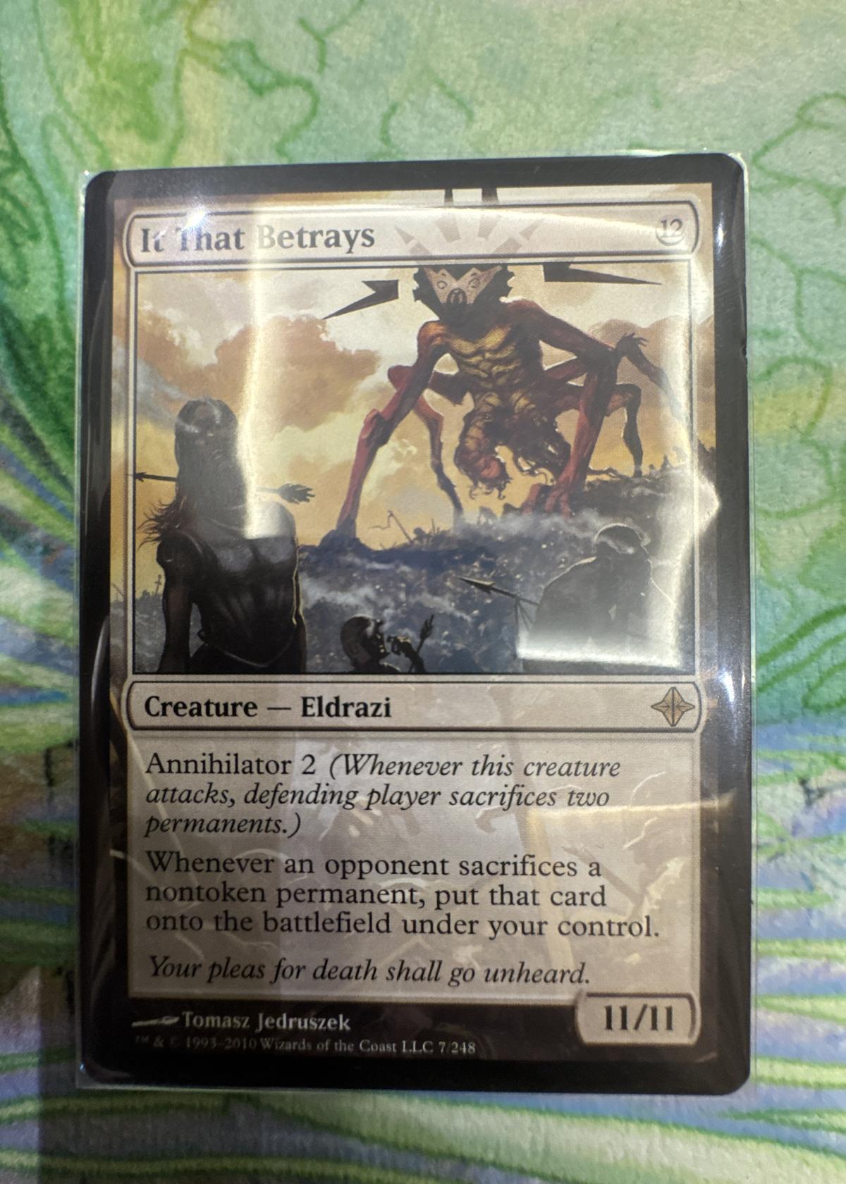 It That Betrays is a powerful Eldrazi creature card illustrated by Tomasz Jedruszek, from the Rise of the Eldrazi set. This card features the Annihilator 2 mechanic and the ability to steal nontoken permanents opponents sacrifice. It has a significant impact in Commander and casual formats, making it both playable and collectable. This particular card is in English and has a normal (non-foil) printing.