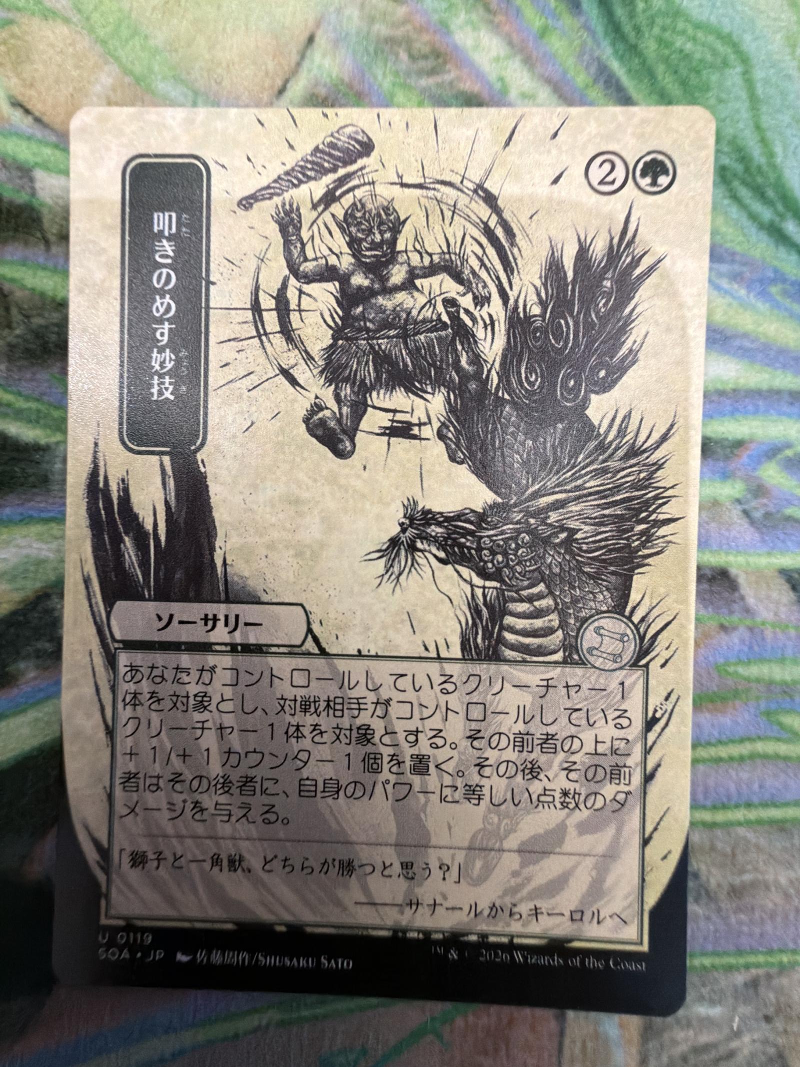 Japanese language Magic The Gathering card '叩きのめす妙技' from the set 'Strixhaven' (SOA). Illustrated by Shigeki Sato. This card is a sorcery with unique black and white art style. Playable in meta as a removal spell. Not foil.