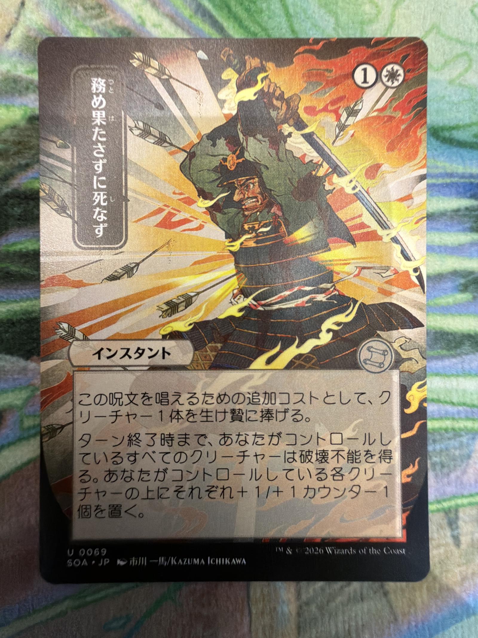 Japanese language card from Strixhaven: School of Mages set. The card is Duty Beyond Death, illustrated by Kazuma Ichikawa. It is playable in various Magic: The Gathering formats where Strixhaven cards are legal and is both a collectible and competitive card due to its powerful effect.