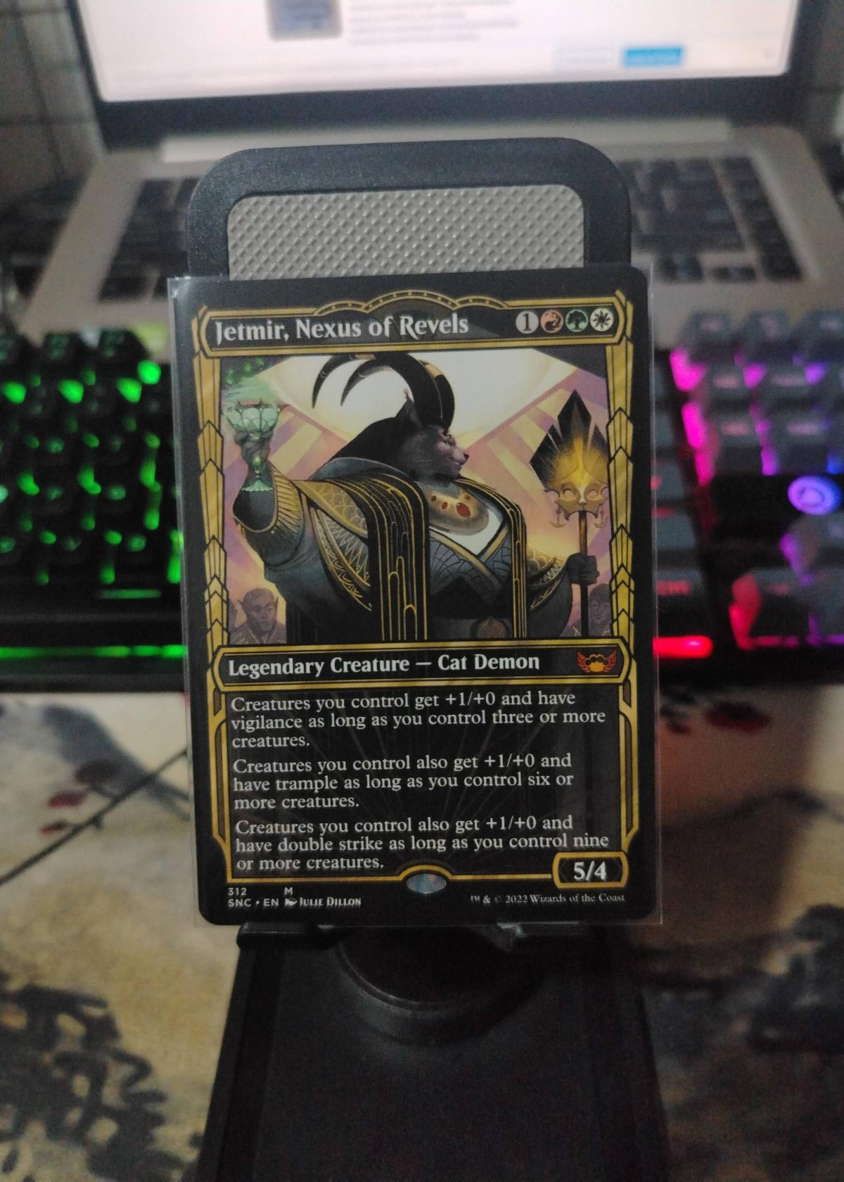 Jetmir, Nexus of Revels is a Legendary Creature — Cat Demon from the Magic: The Gathering set Streets of New Capenna (SNC). Illustrated by Julie Dillon, this card provides significant synergies with token and go-wide strategies in Commander/EDH formats and is especially popular as a commander in those decks. The card is printed in English and has a unique frame art treatment. This copy is not foil or graded.