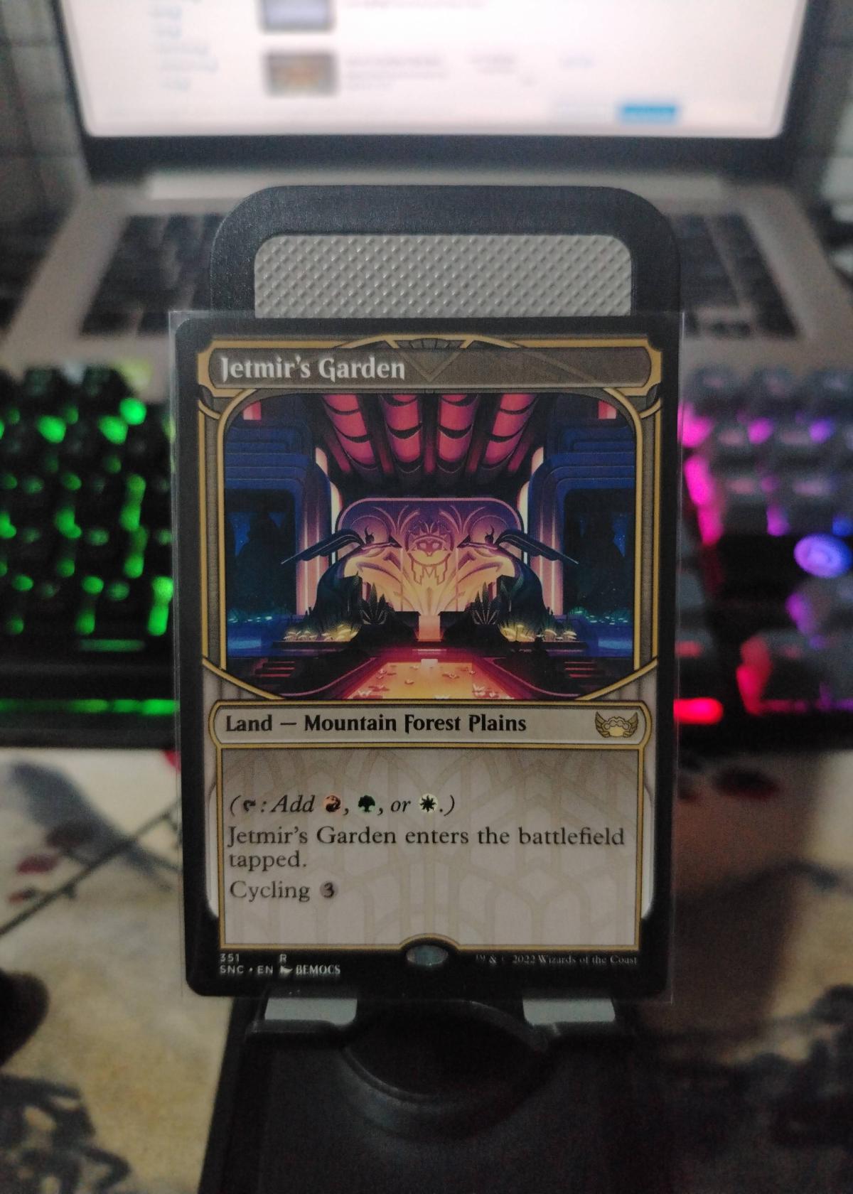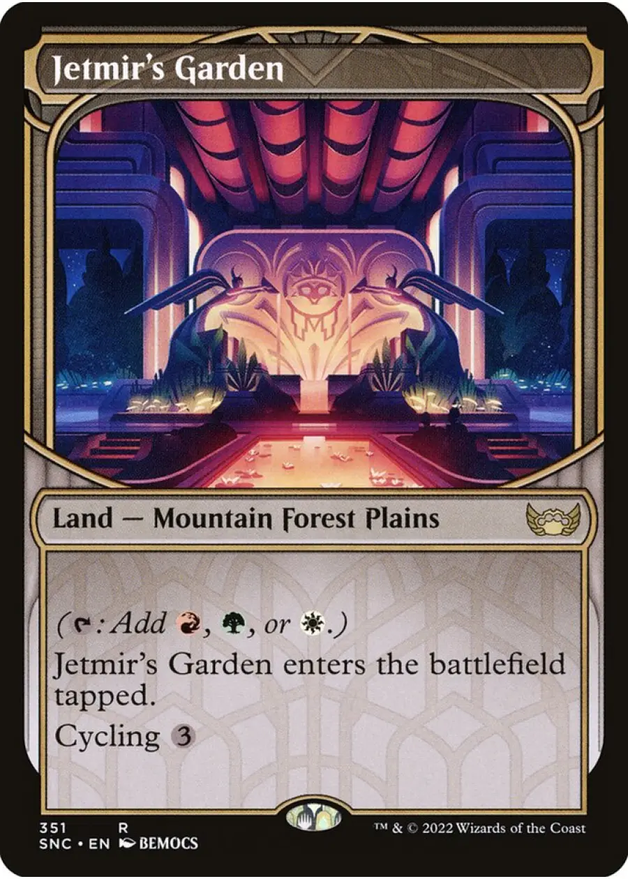 Jetmir's Garden is a tri-land from the Streets of New Capenna (SNC) set, illustrated by artist BEMOCS. This card is a popular choice for Constructed and Commander formats due to its ability to fix mana for three colors (Red, Green, White) and its cycling ability. This is a regular (non-foil) English version. The card enters the battlefield tapped and provides key mana versatility, making it both playable in meta and collectible.