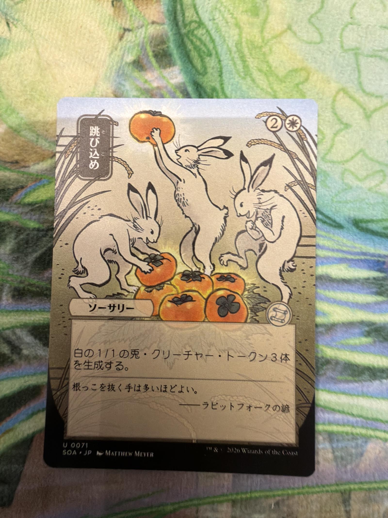 Hop to it (跳び込め) from the SOA set, card number 71. This is a Japanese language full art sorcery card illustrated by Matthew Meyer. The card generates three 1/1 white Rabbit creature tokens.
