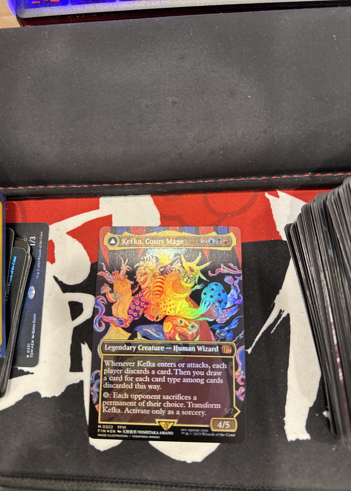Kefka's abilities include forcing each player to discard a card upon entering or attacking, and drawing cards based on the types discarded, with a powerful transformation option to force opponents to sacrifice permanents. This card blends thematic appeal with solid gameplay potential.