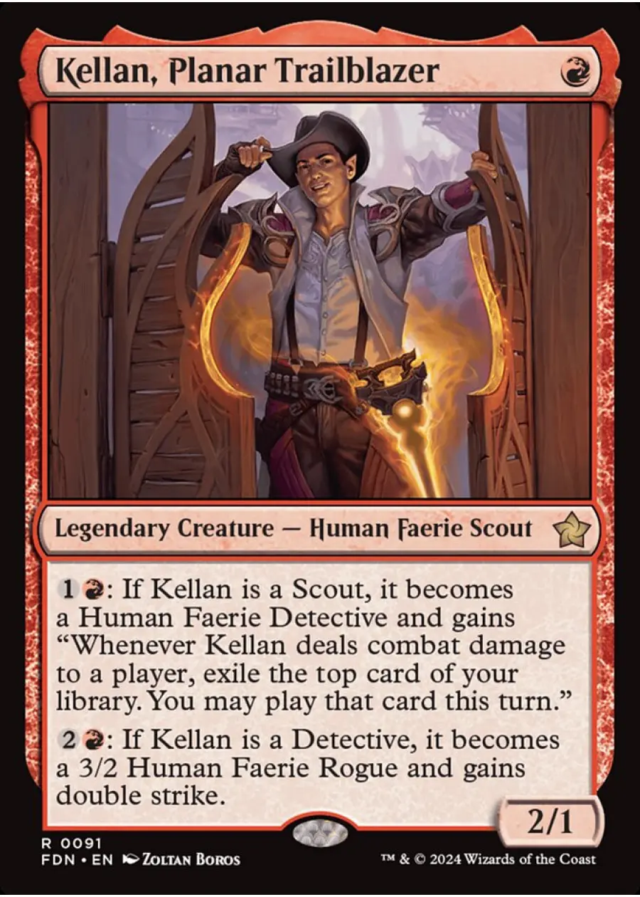 : If Kellan is a Scout, it becomes a Human Faerie Detective and gains "Whenever Kellan deals combat damage to a player, exile the top card of your library. You may play that card this turn."