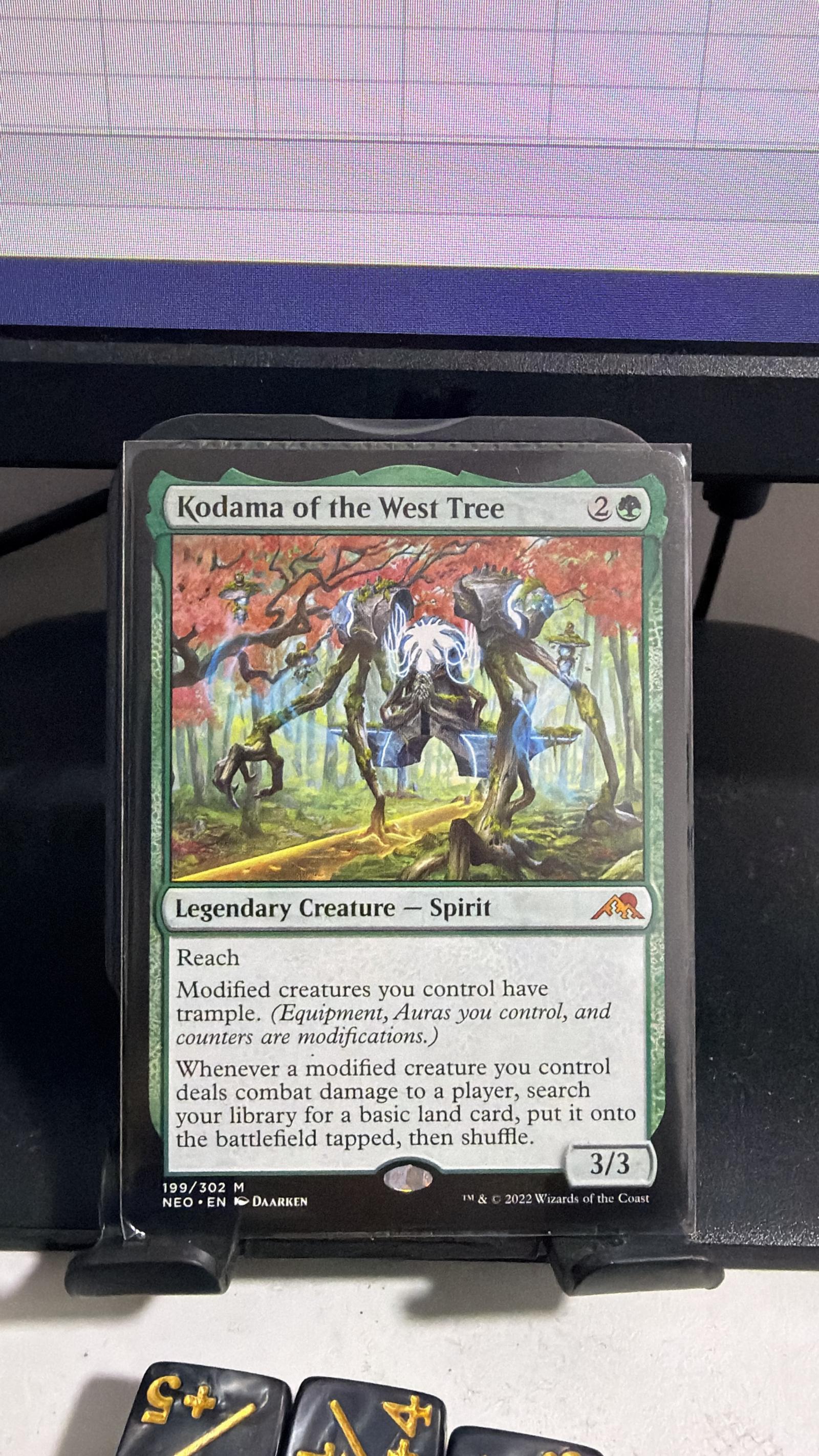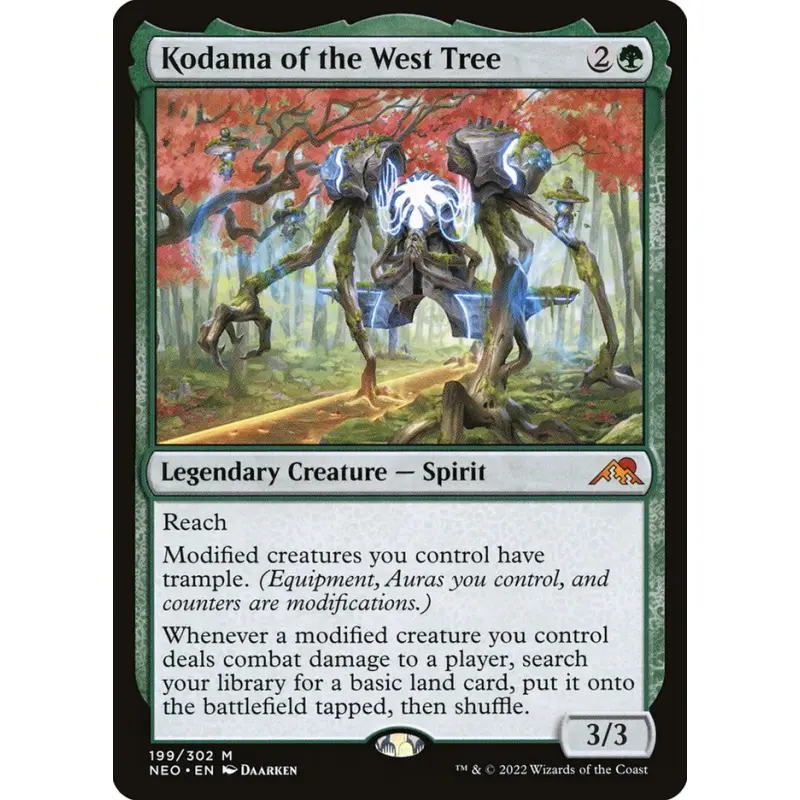 Kodama of the West Tree is a Legendary Creature - Spirit from the NEO set, illustrated by Daarken. This green card is part of the 2022 Magic: The Gathering release. It provides reach and grants trample to modified creatures you control, helping land ramp when dealing combat damage. The card is in English and has a normal printing treatment. It's playable in various casual and thematic decks involving equipment or auras.