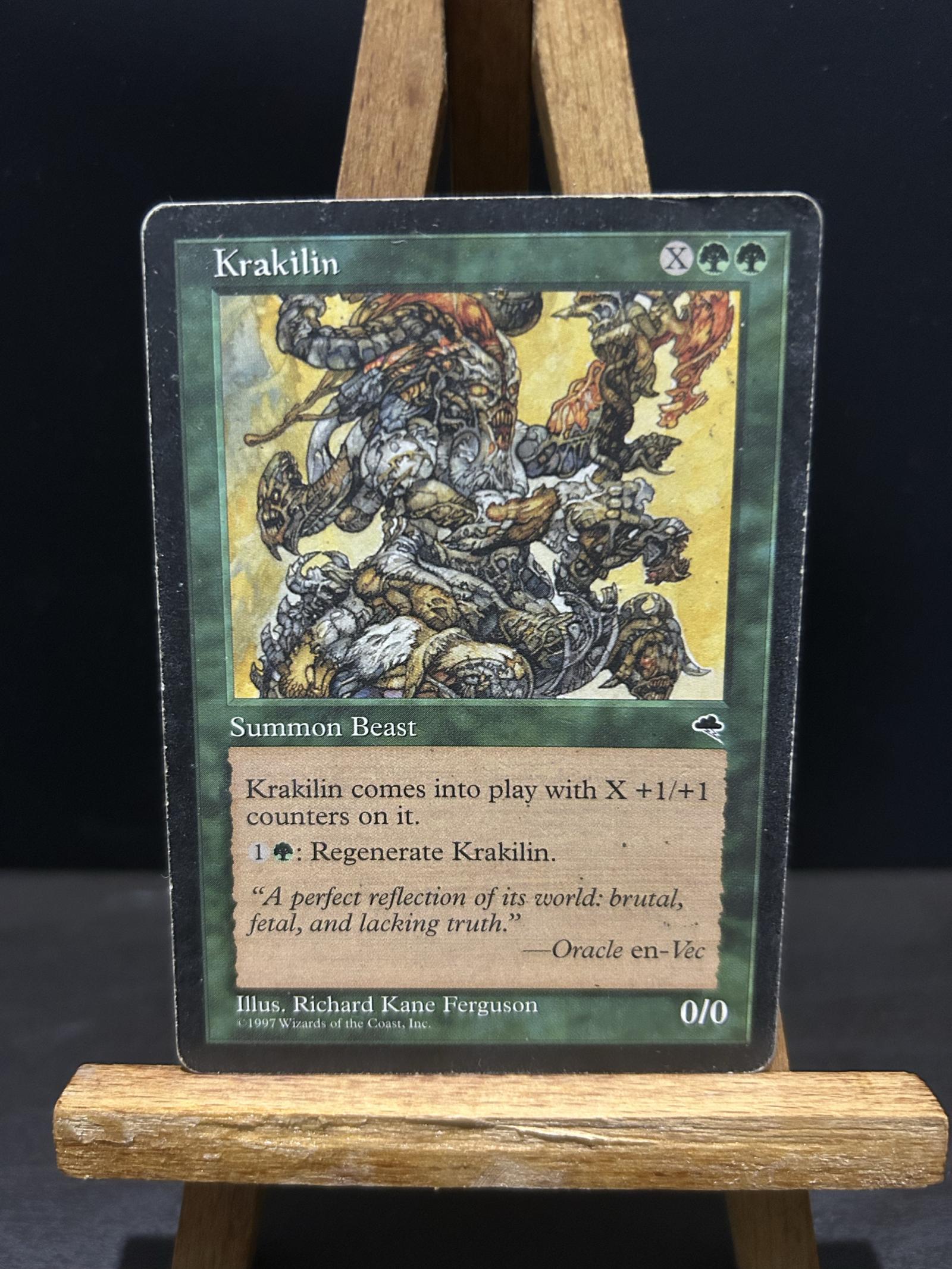 Krakilin from the Weatherlight set, illustrated by Richard Kane Ferguson. This green Summon Beast card is known for its playability in certain green ramp and regeneration decks. The card text reads: 'Krakilin comes into play with X +1/+1 counters on it. 1G: Regenerate Krakilin.' It is a non-foil card from 1997, collectible and playable in some niche meta decks.
