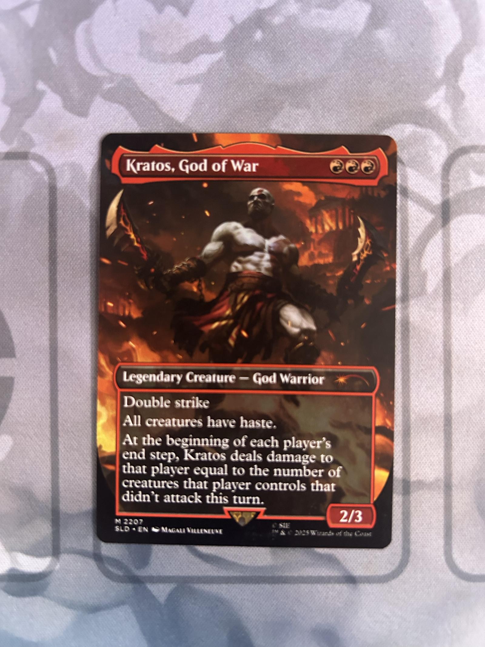 Kratos, God of War card from Magic the Gathering Secret Lair Drop (SLD) set. Card number 2207. Artist: Magali Villeneuve. This is a collectible legendary creature - God Warrior card with double strike and haste abilities. A full art card with special damage effect. Foil treatment not specified. Playable in various Commander and casual MTG formats.