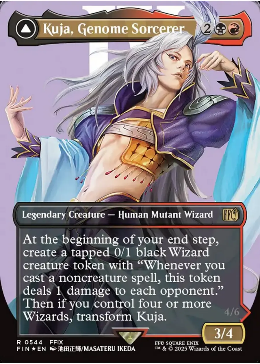 At the beginning of your end step, create a tapped 0/1 black Wizard creature token with "Whenever you cast a noncreature spell, this token deals 1 damage to each opponent." Then if you control four or more Wizards, transform Kuja.