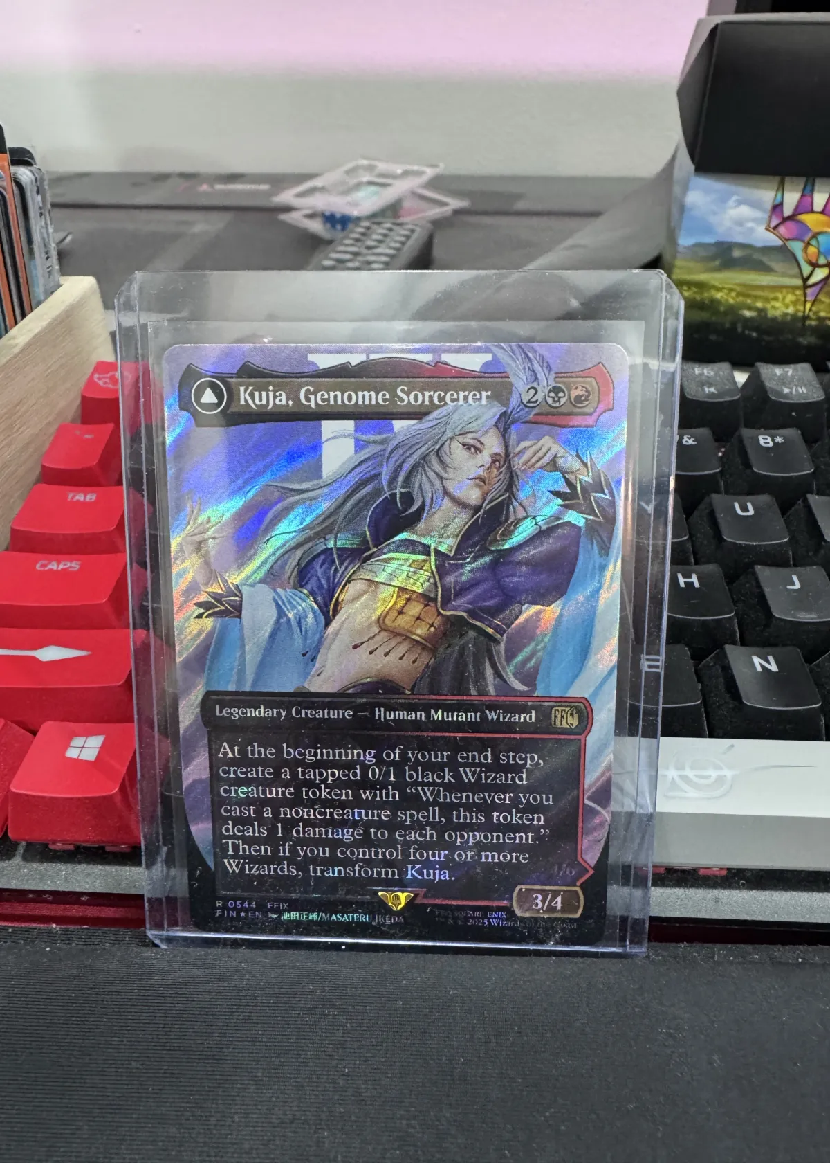 This is a raw, ungraded Magic The Gathering promo card featuring Kuja, Genome Sorcerer, which transforms into Trance Kuja, Fate Defied. Card number FIN 544 comes from the Final Fantasy XIV crossover set and is illustrated by Masateru Ikeda. The card showcases a Legendary Creature - Human Mutant Wizard with dynamic transformation mechanics, generating value with Wizard tokens and damage output when casting noncreature spells. Its unique status as a Final Fantasy crossover card and its transformation ability make it popular among collectors and thematic decks alike. The card is in raw condition, offering a chance for grading or inclusion in a specialized collection focused on crossover or cinematic artwork cards.