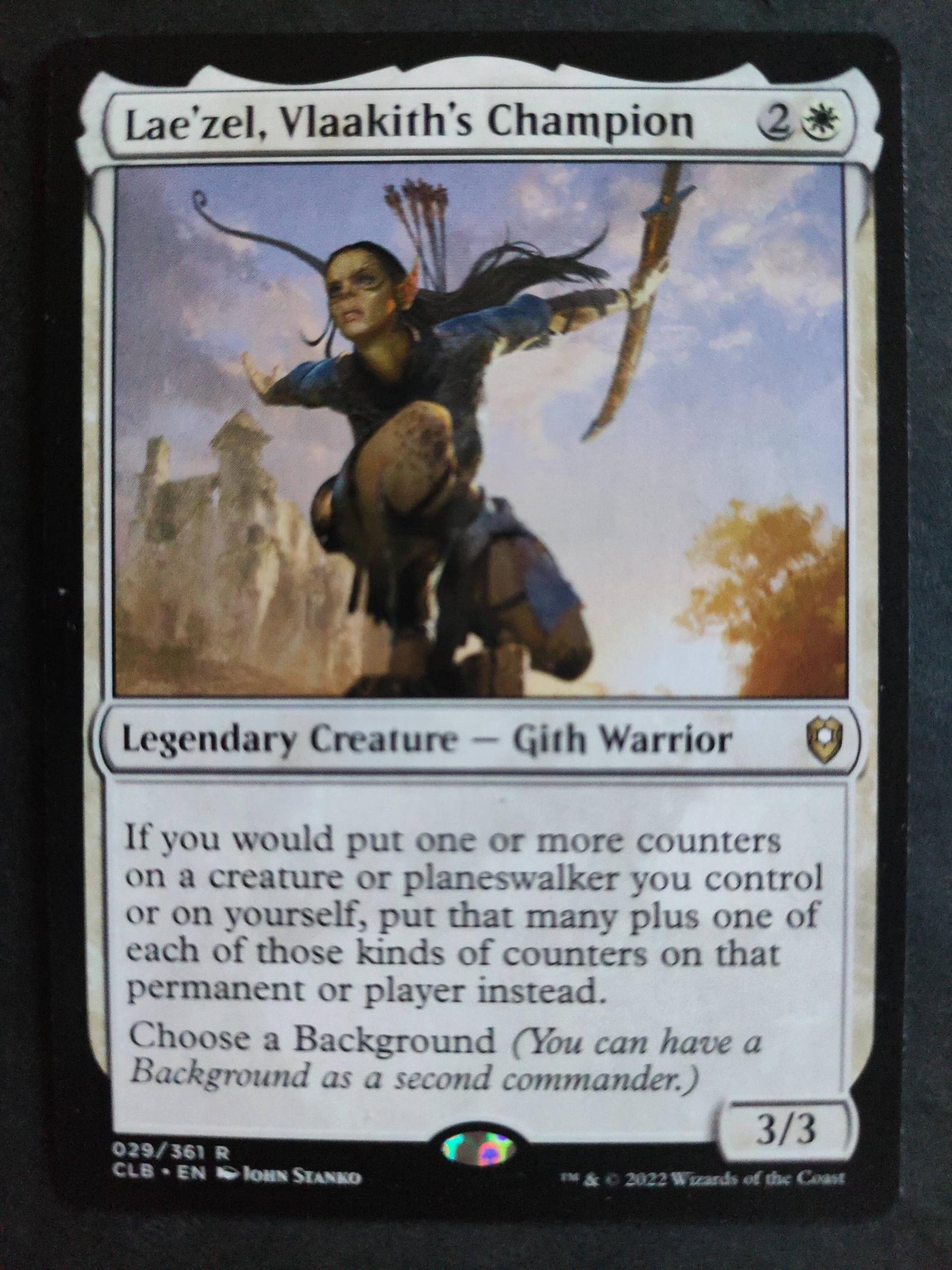 Lae'zel, Vlaakith's Champion is a legendary Gith Warrior creature card from the Call of the Beast set (CLB). It features artwork by John Stanko. This card is rare and playable in many Commander decks, especially those focusing on counters. The card is the regular non-foil version and is in English.