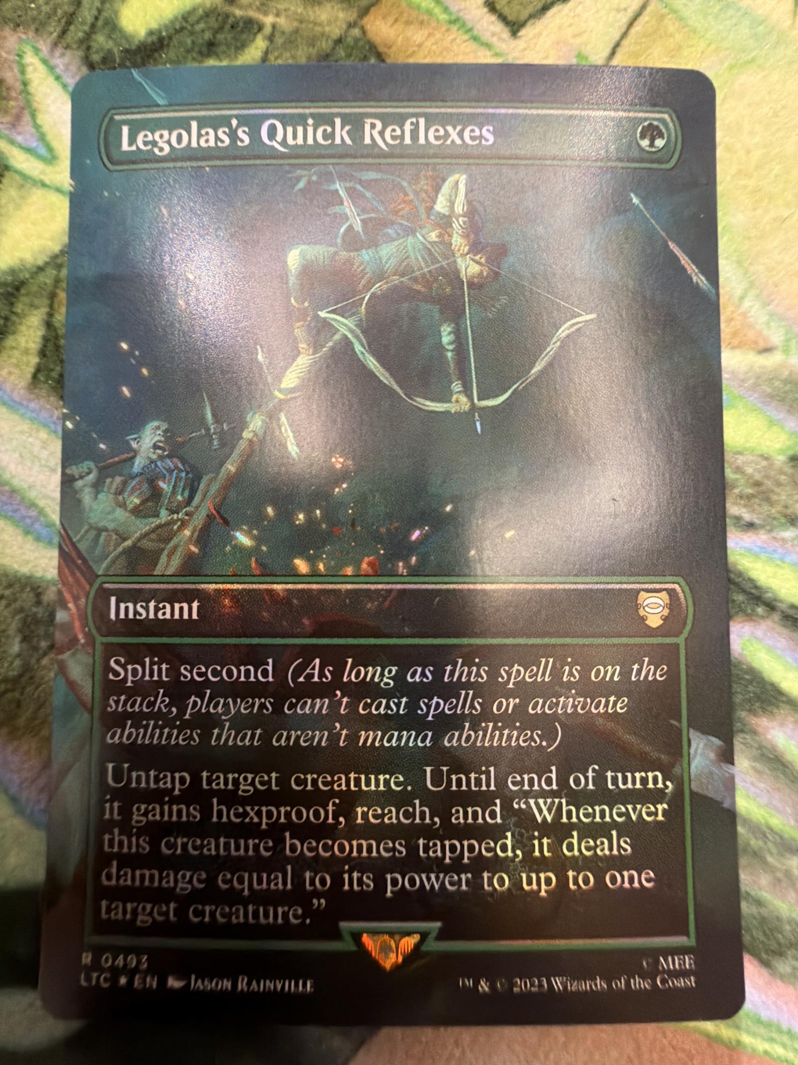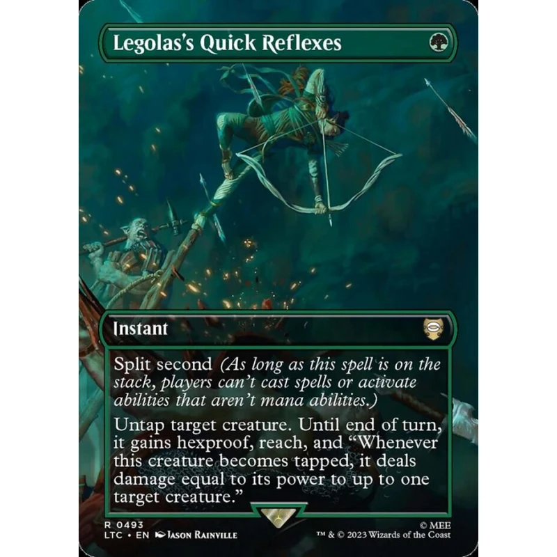 Legolas's Quick Reflexes from Magic: The Gathering, artist Jason Rainville. This is a promotional card from the LTC set, featuring unique artwork. The card is instant-speed with split second and grants targeted creature hexproof, reach, and a damage effect. It is a playable card with utility in some formats. The card shown is a foil version.