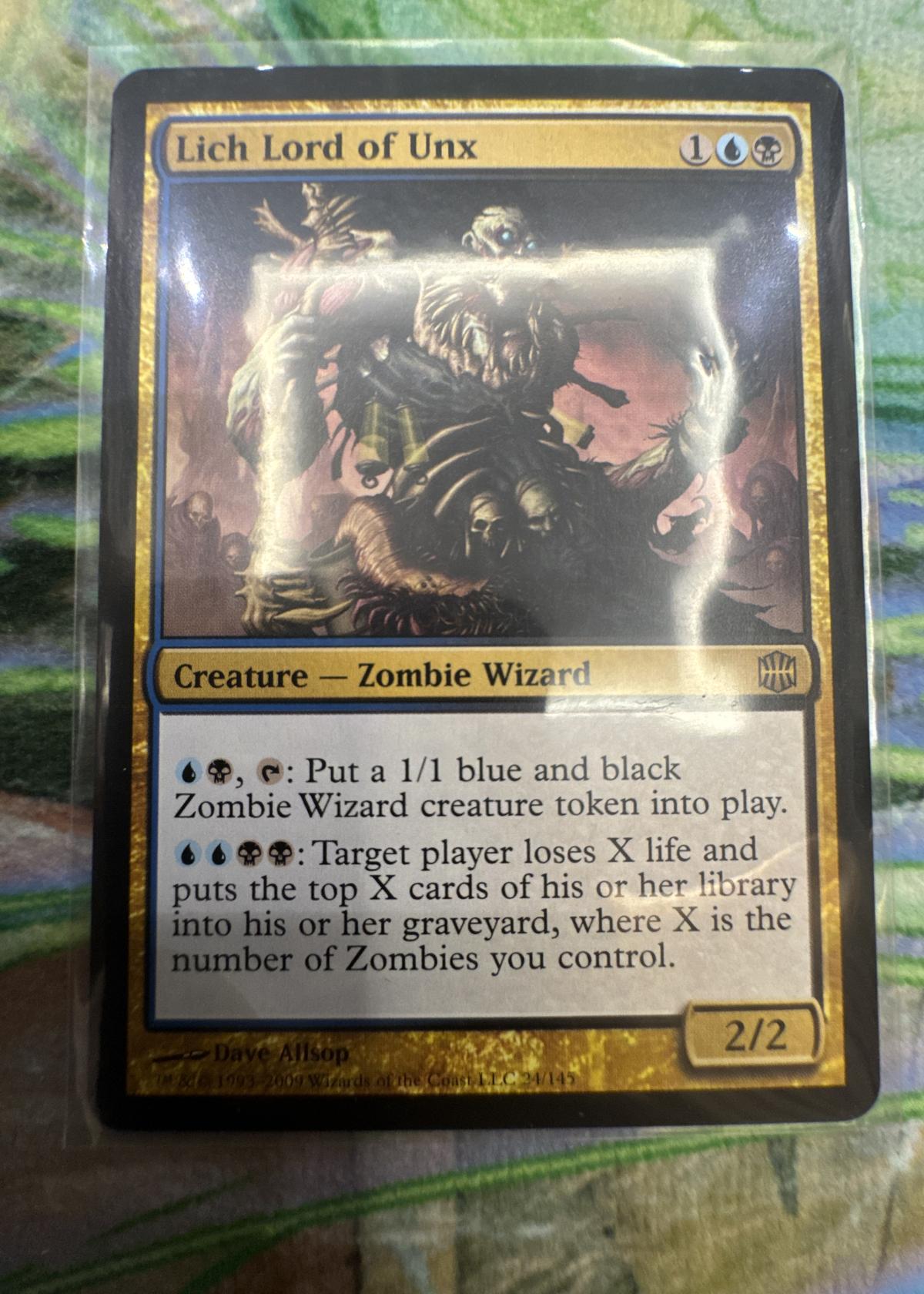 Lich Lord of Unx is a rare Magic: The Gathering card illustrated by Dave Allsop from the 'Alara Reborn' set. The card allows token generation and has an ability impacting both life and library size based on the number of Zombies you control. Though a popular pick for tribal Zombie or mill Commander decks, it's generally considered more collectible than strictly meta-playable in competitive environments. This card is non-foil.