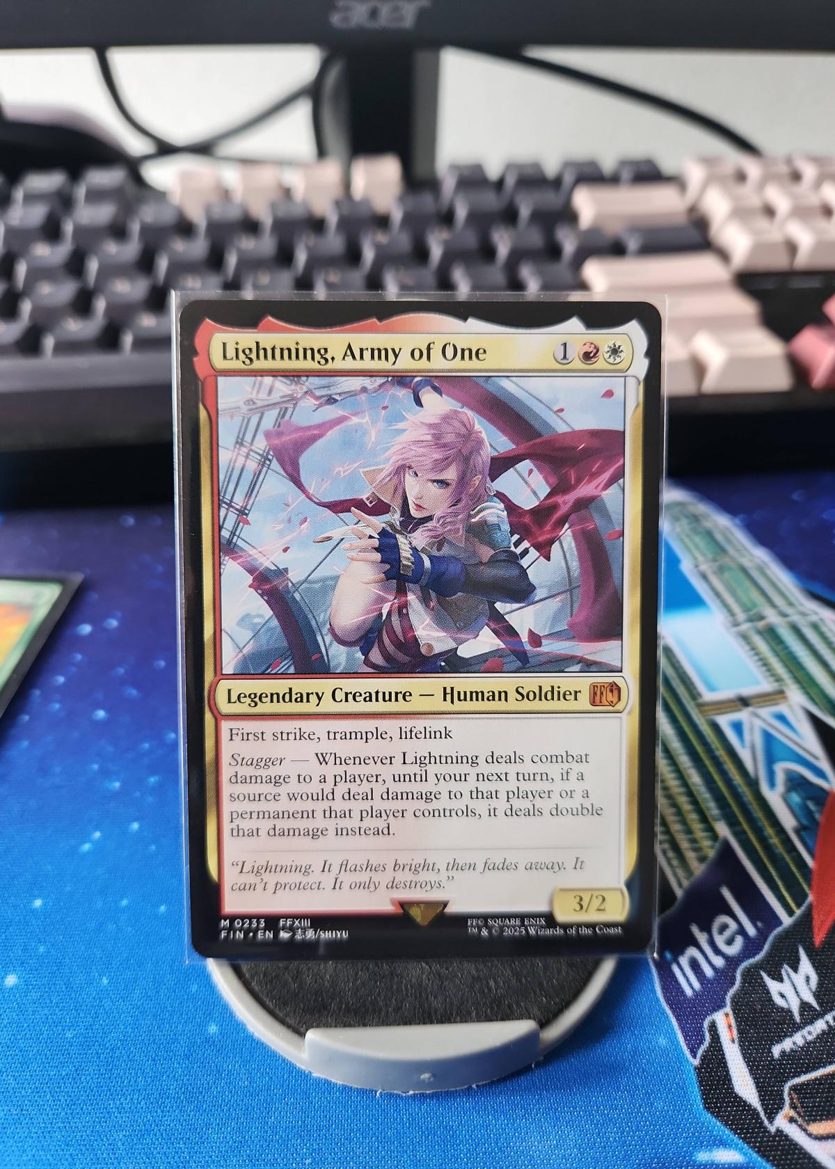 Lightning, Army of One is a Legendary Creature – Human Soldier card from the Magic: The Gathering Universes Beyond Final Fantasy crossover set (FFXIII). This particular card is in English, with collector number 233. The card features mechanics such as first strike, trample, lifelink, and Stagger—making it potentially playable in Commander or casual constructed formats, though it may be more collectible due to its crossover nature. The art is dynamic and features Lightning from Final Fantasy XIII. The card shown is a regular (non-foil) version. Artist is credited as SHIVYU.