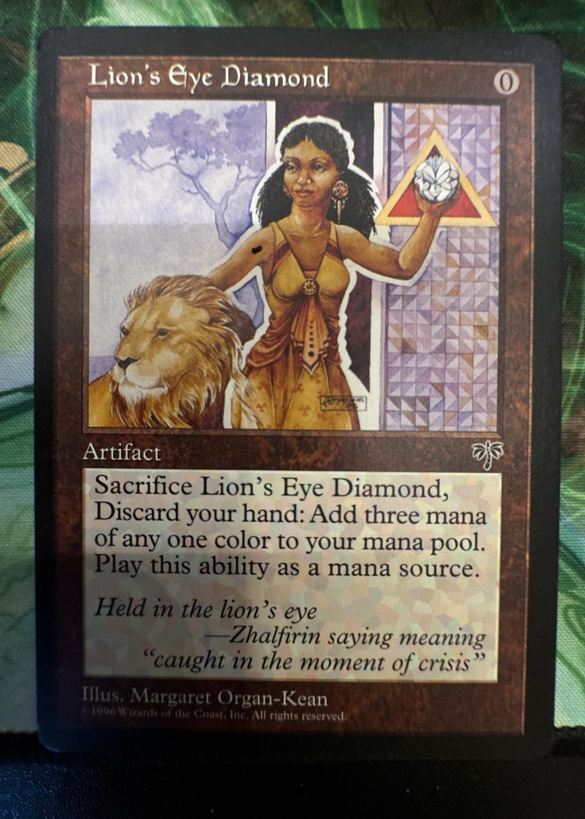 Lion's Eye Diamond from the Mirage set, illustrated by Margaret Organ-Kean. This is a highly sought-after and powerful Magic: The Gathering artifact card, often used in competitive Legacy and Vintage formats due to its combo potential, but is also prized by collectors. This non-foil, English-language version is a staple in many combo decks, and is notable for its iconic artwork and playability.