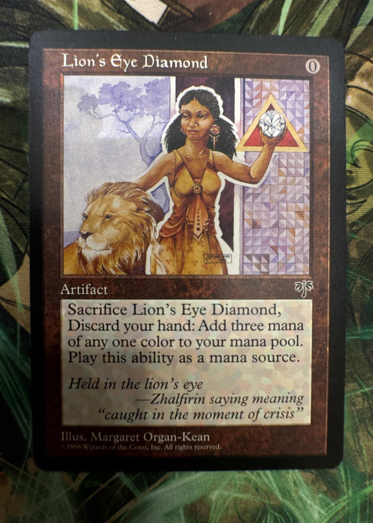 Lion's Eye Diamond is an iconic artifact card from Magic: The Gathering's Mirage set, illustrated by Margaret Organ-Kean. This non-foil version is highly sought after for its powerful ability to generate three mana at the cost of discarding your hand. The card is playable in various Legacy and Vintage decks and remains a key combo piece in competitive formats. A collectible and meta-relevant card, especially valued by players and collectors.