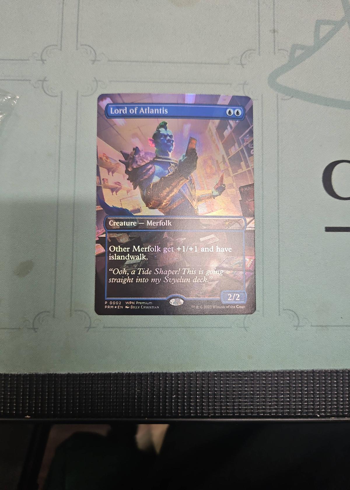 This is a foil promo Lord of Atlantis card from the WPN Premium PRM set, illustrated by Billy Christian. Card grants other Merfolk +1/+1 and islandwalk—an iconic ability for Merfolk tribal decks. Card number 2. English language. Highly collectible as a promotional foil; also playable in Modern and Legacy Merfolk decks.