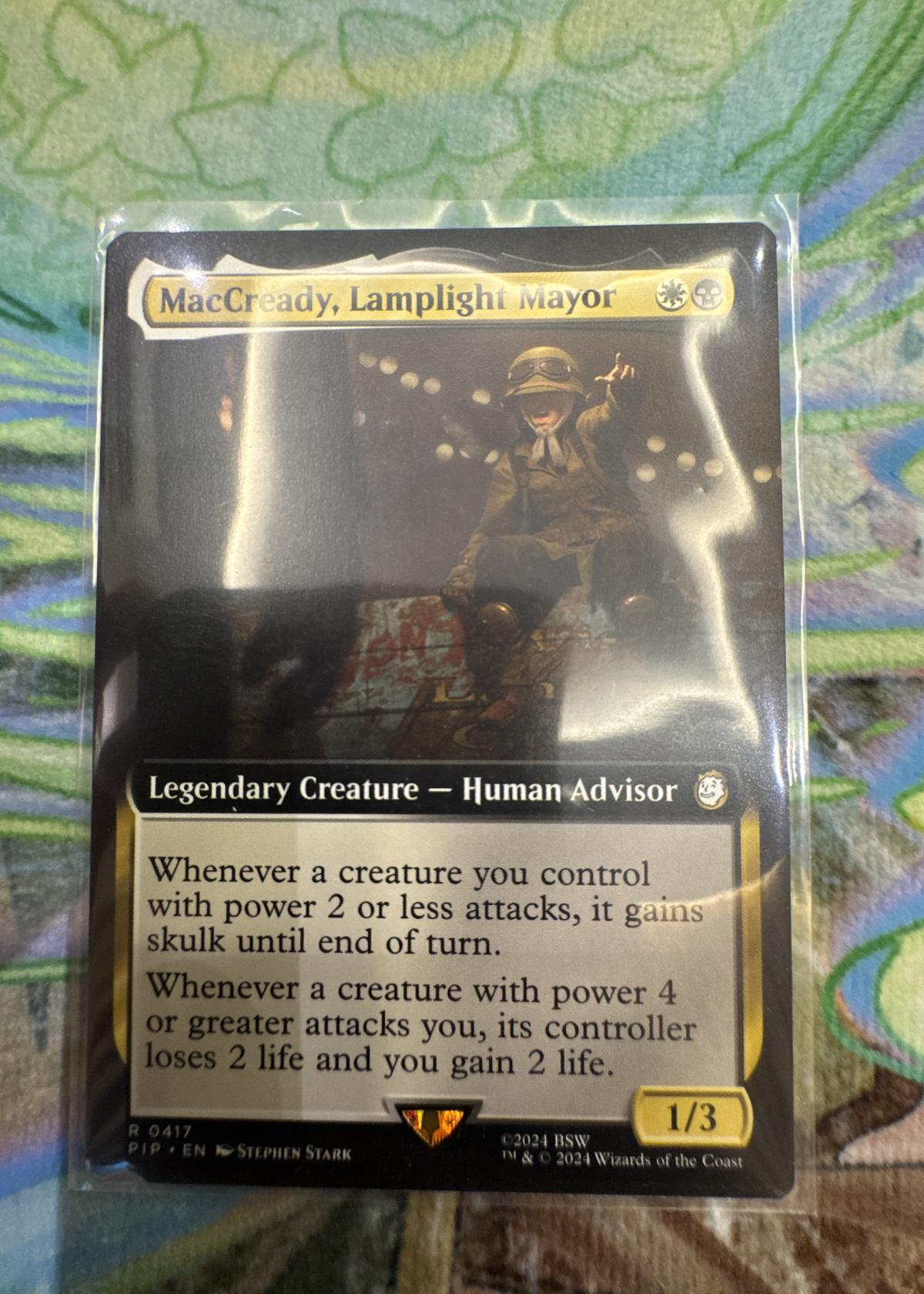 MacCready, Lamplight Mayor is a rare Magic: The Gathering card from the Fallout crossover set (BSW). Illustrated by Stephen Stark, this legendary creature – Human Advisor offers unique mechanics ideal for both casual and commander gameplay, involving skulk and life-swapping triggers. The EA card is printed in English and is a non-foil version. Collectible for both fans of Magic and Fallout, the set features crossover thematic art and mechanics.