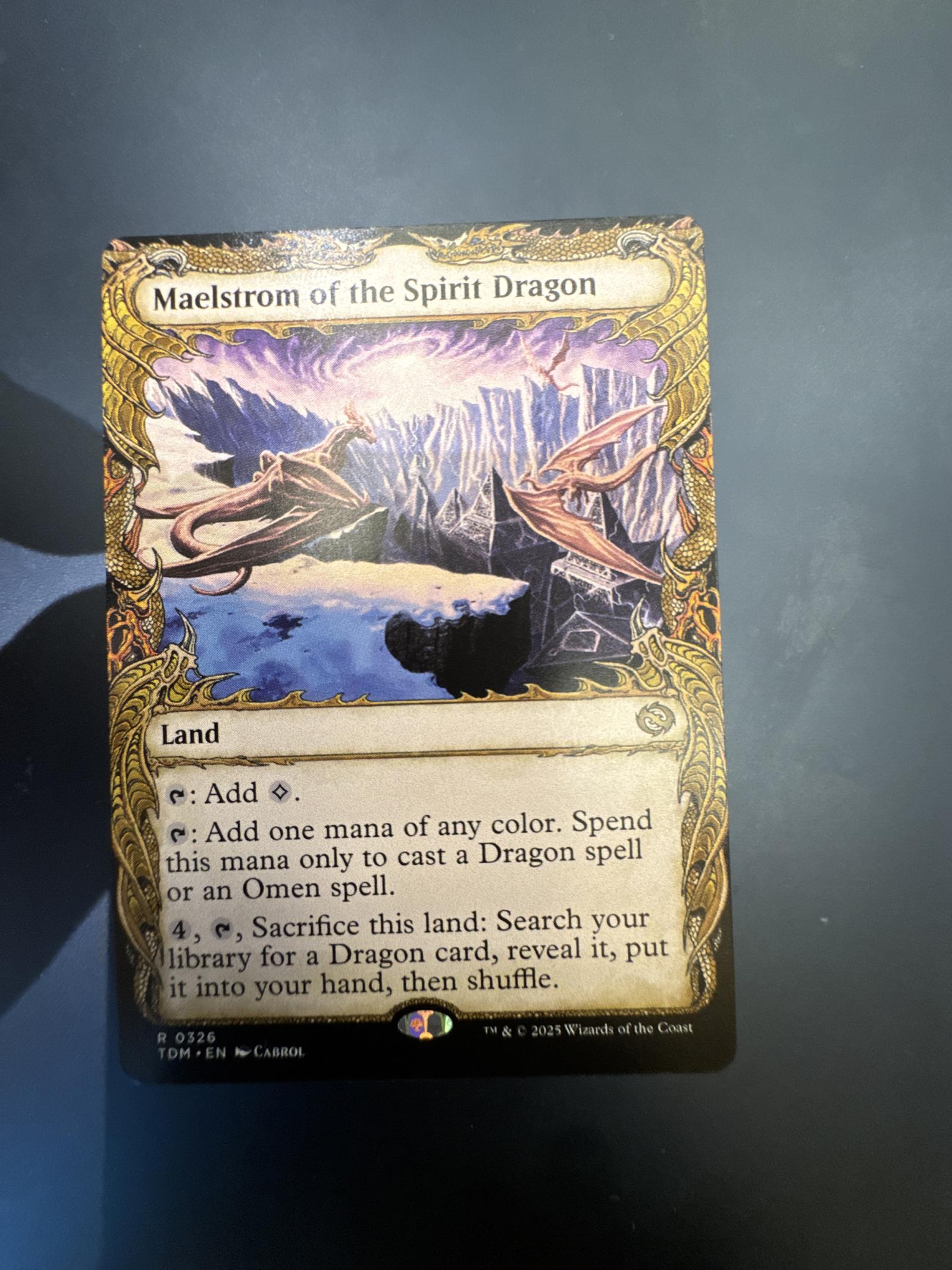 Maelstrom of the Spirit Dragon is a land card from the set 'The Dragon's Maze' (TDM), illustrated by Carrol. This card has an alternate printing treatment. It is playable in Dragon or Omen spell decks due to its mana abilities and synergy with Dragon cards. The card number is 326, language is English. The treatment makes it a desirable collectible.