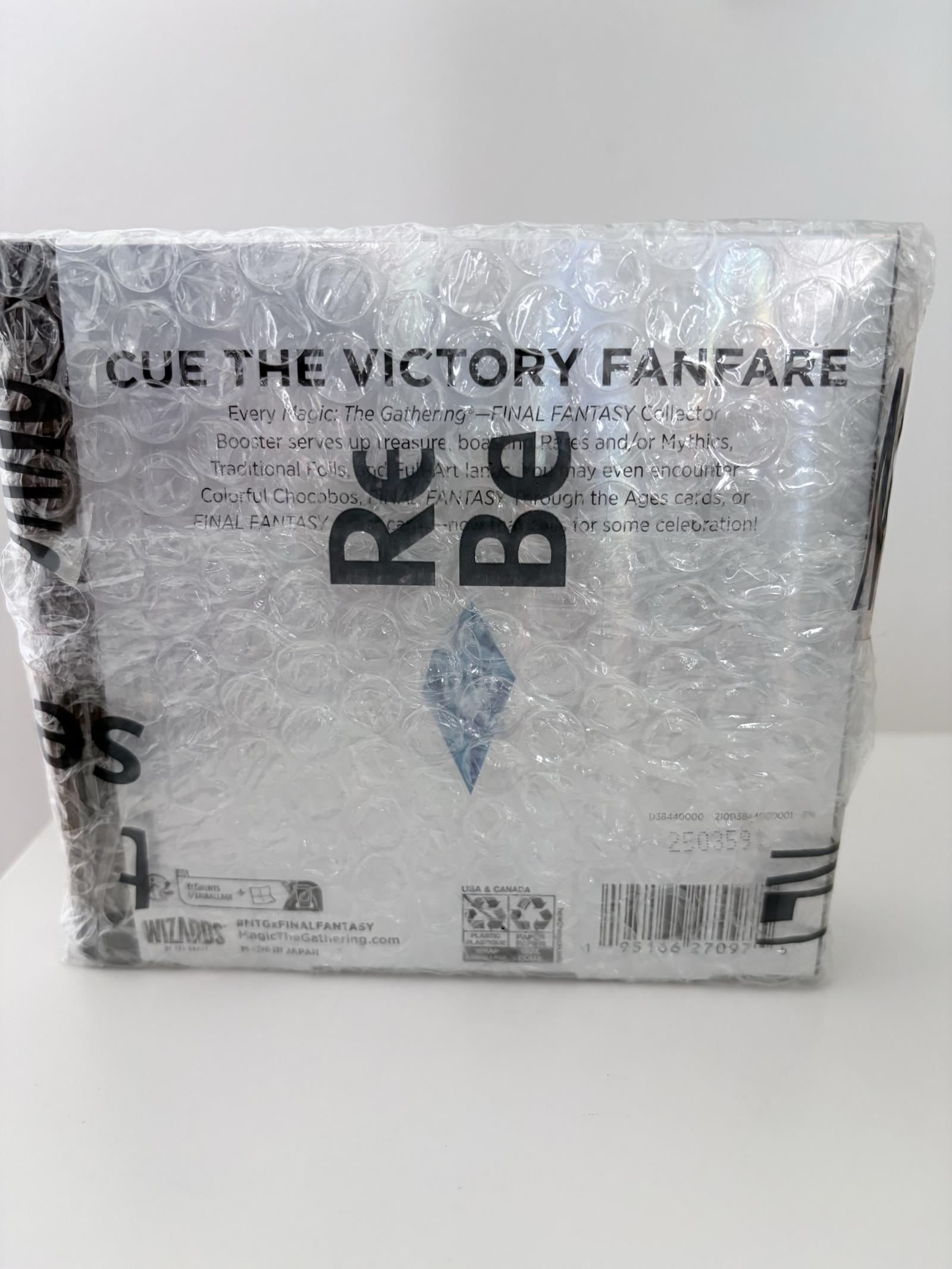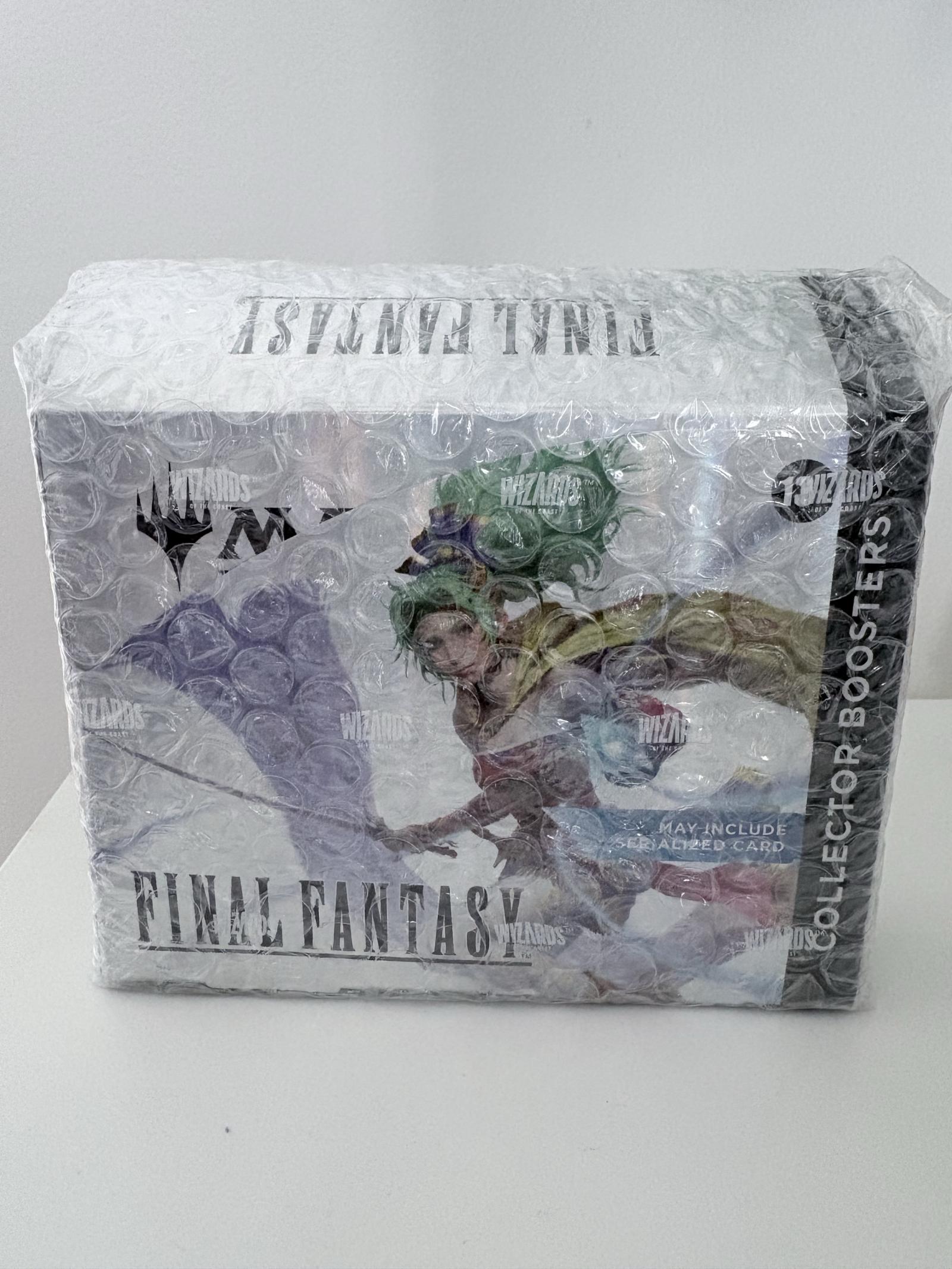 This is a sealed Magic The Gathering Final Fantasy Collector Booster Box. It may include serialized cards, traditional foils, and art land cards featuring colorful Chocobos and iconic Final Fantasy imagery. The set was produced by Wizards of the Coast and combines collectible aspects with playable cards. The box is unopened and wrapped in bubble wrap, perfect for collectors and fans of both Magic The Gathering and Final Fantasy.