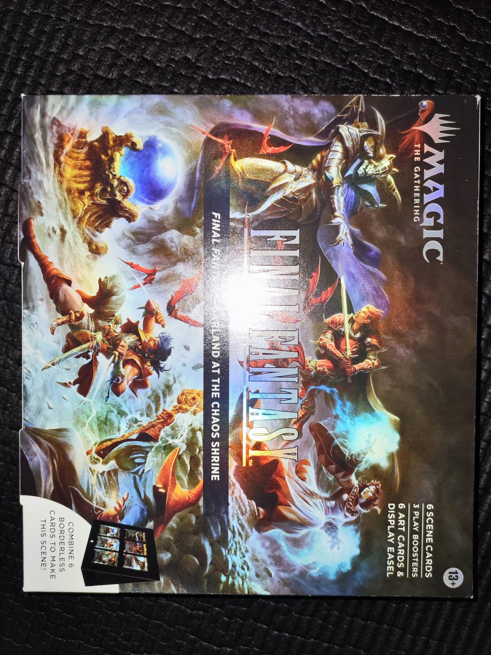 This product features the Final Fantasy crossover with Magic: The Gathering, including 6 scene cards, 3 play boosters, and a display easel. It combines 6 borderless card arts to make this unique scene. Suitable for collectors and fans of both franchises. Not a single card but a special promotional set. Language and card number not applicable.