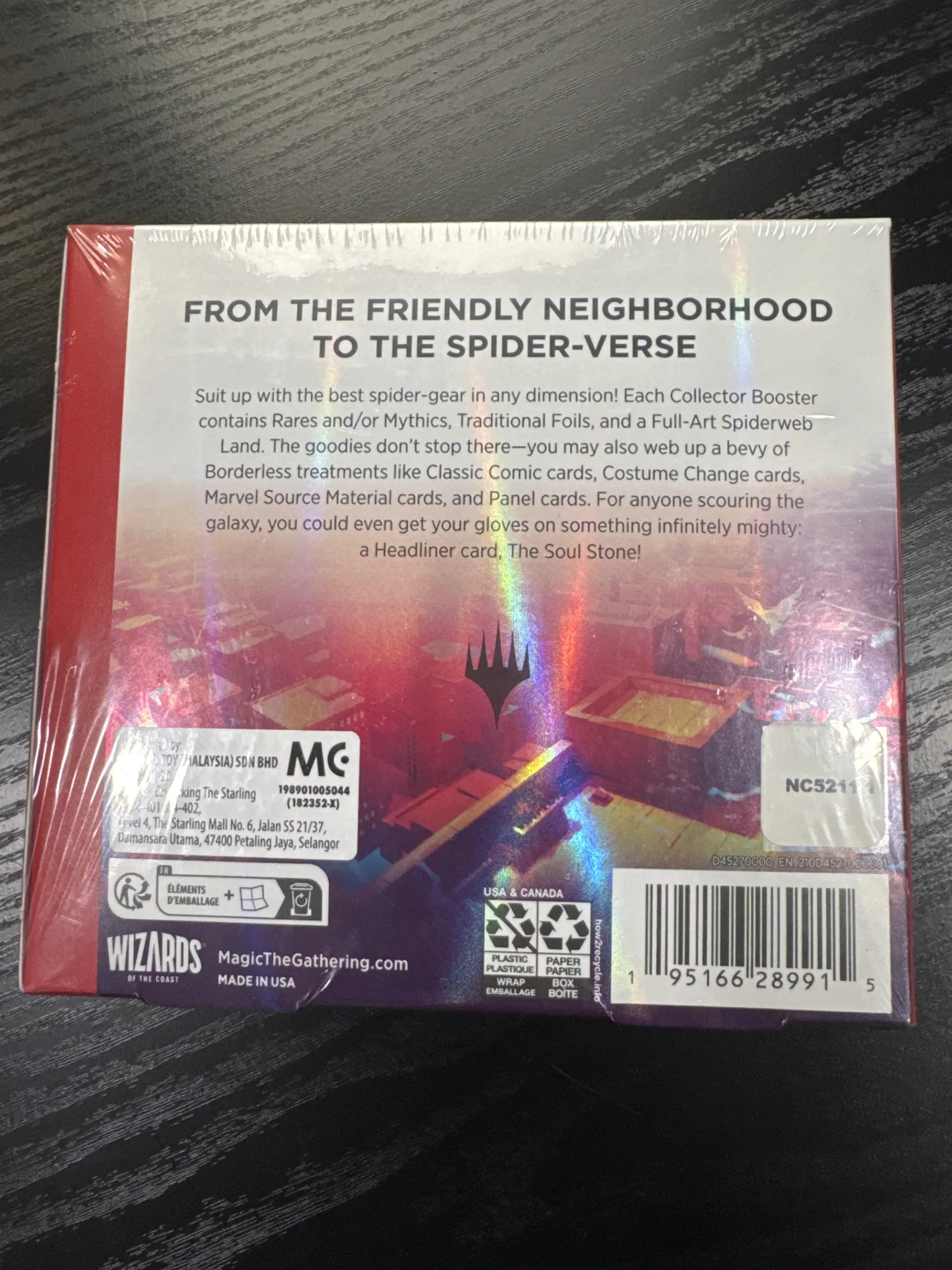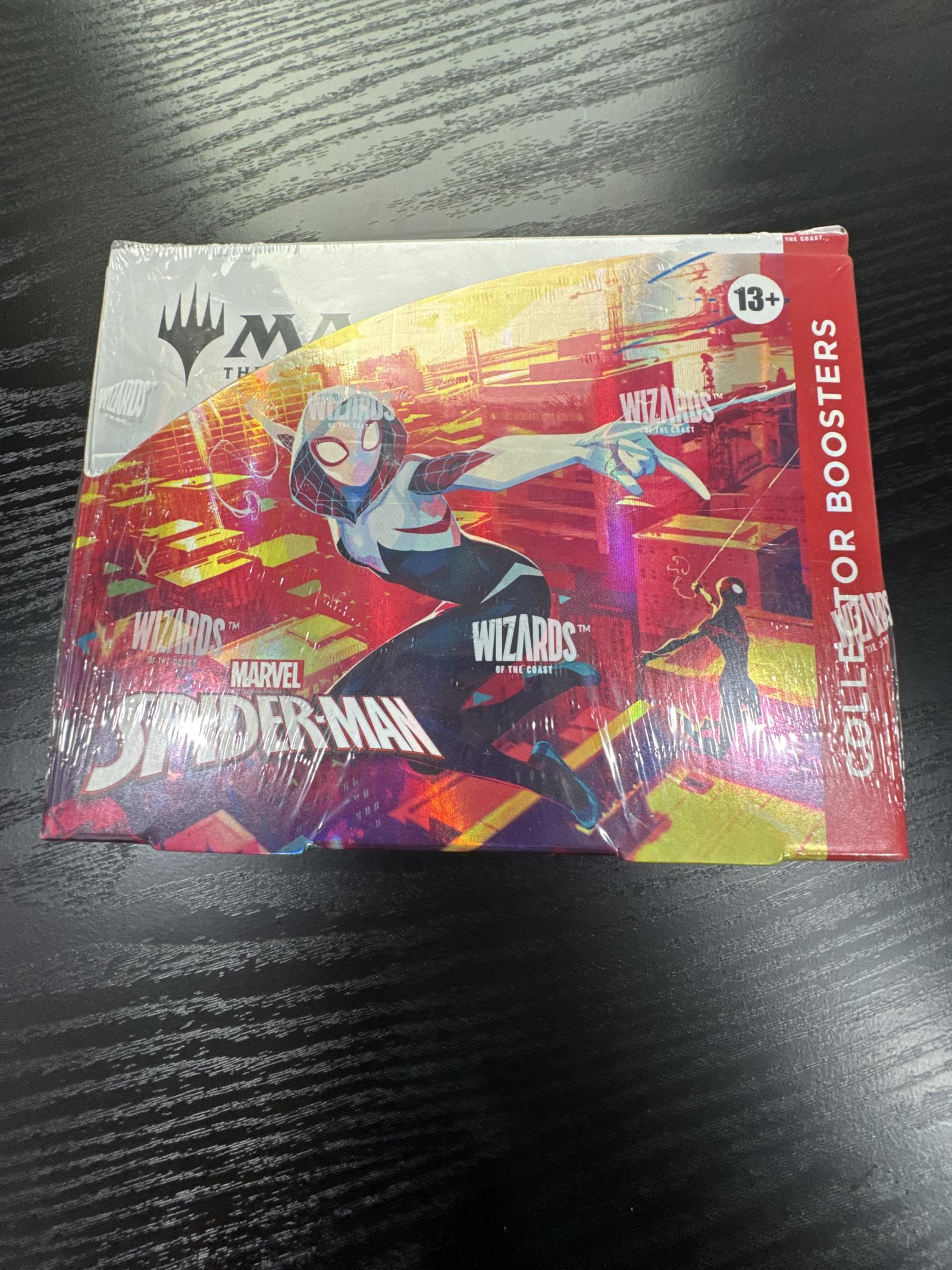 Notable features: This is a Collector Booster box from the Magic: The Gathering x Marvel Spider‑Man crossover set. Collector Boosters are curated for premium content and typically contain a high concentration of foil treatments, alternate art cards, extended art, Showcase-style designs, and higher‑rarity cards compared with Draft or Set boosters. Expect a mix of foil and non‑foil printings and chase variants that are popular with collectors.