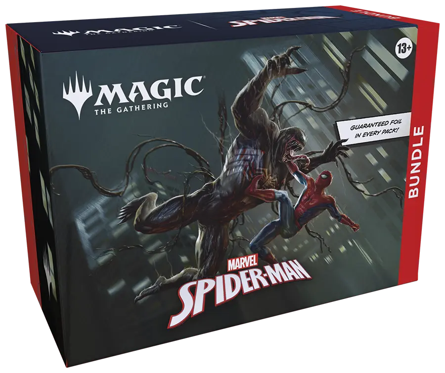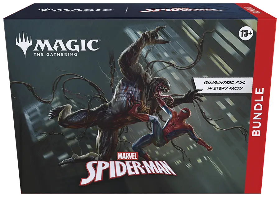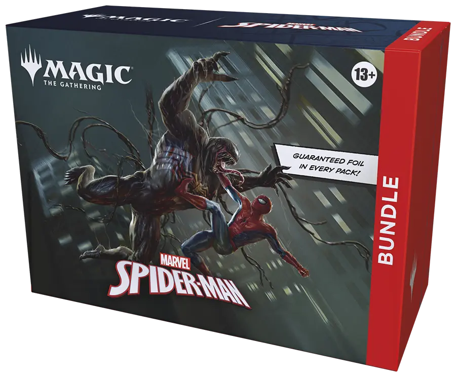 Your friendly neighborhood Spider-Man swings into Magic: The Gathering, and not a moment too soon! Gather web-slingers from across the Spider-Verse and team up to take down the sinister foes that threaten the city. Keep your Spider-Senses primed to spot Borderless treatments that leap right off the page! The Bundle is a great gift for Spider-Man superfans and newcomers alike who visit your store. They contain a little bit of everything to get a player’s collection off the ground, plus an oversized Spindown life counter themed after the set.