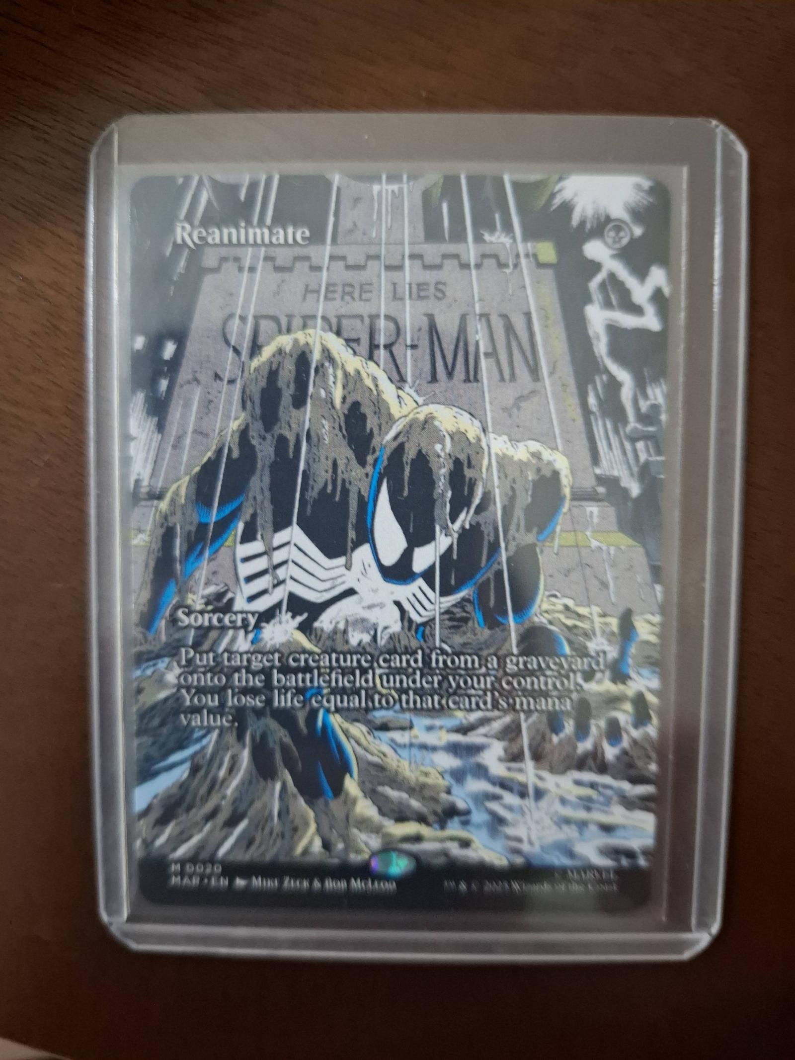 Reanimate is a sorcery card featuring art by Mike Zeck & John McLeod, from a special Marvel comic collaboration promo. This card depicts Venom on Superman's tombstone, blending Magic The Gathering gameplay with collectible Marvel artwork. Playable in limited formats, but mostly sought after as a unique collectible. The card is not foil.