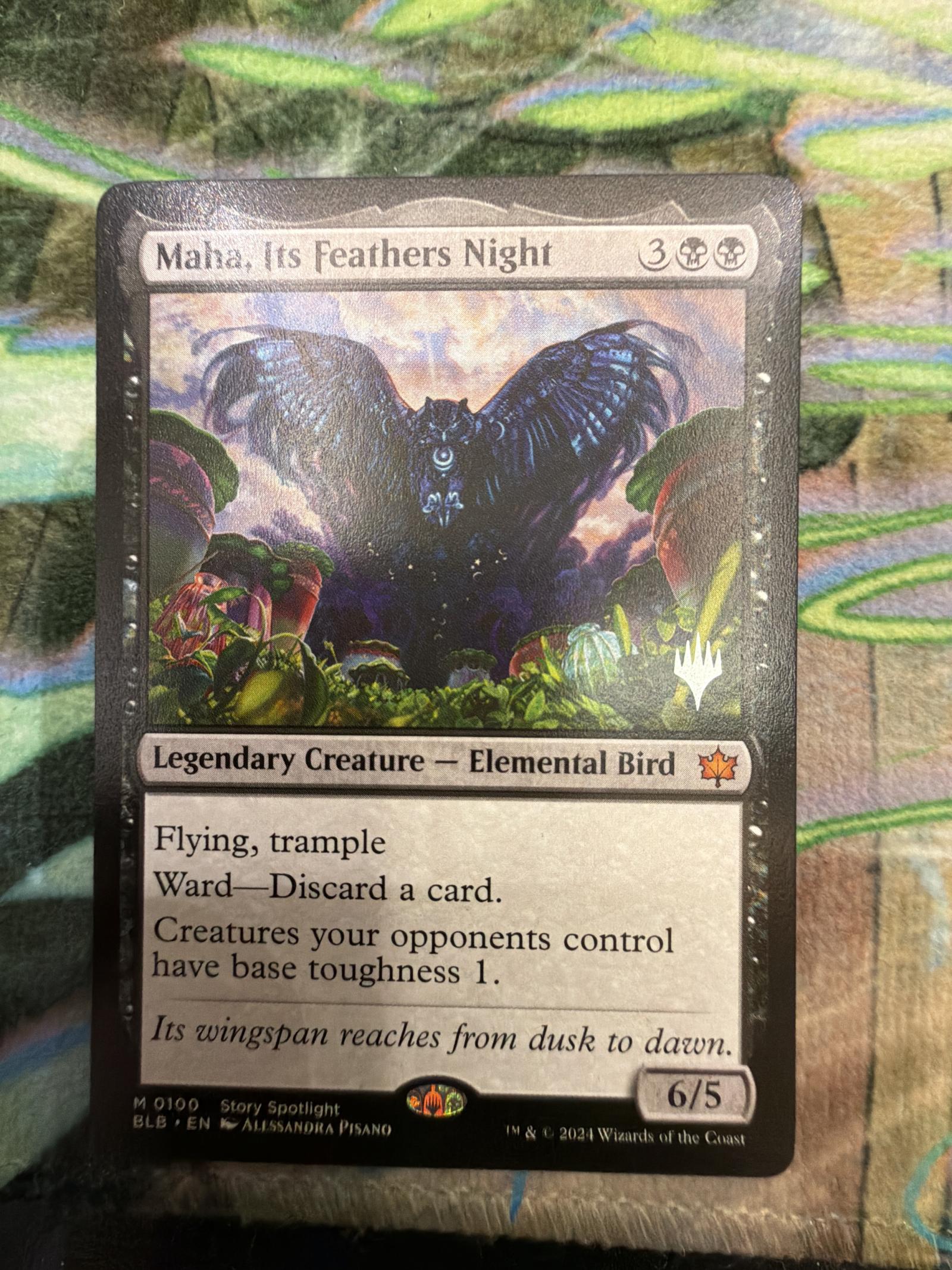Maha, Its Feathers Night is a legendary elemental bird creature card from the Story Spotlight set of Magic The Gathering. The card features artwork by Allissandra Pisano. It has flying, trample, and ward abilities, with a unique effect reducing opponent creatures' toughness. This card is from the 2024 Story Spotlight set and is in English. It is a normal printing and can be playable in certain decks with black creature tribal or toughness manipulation themes.