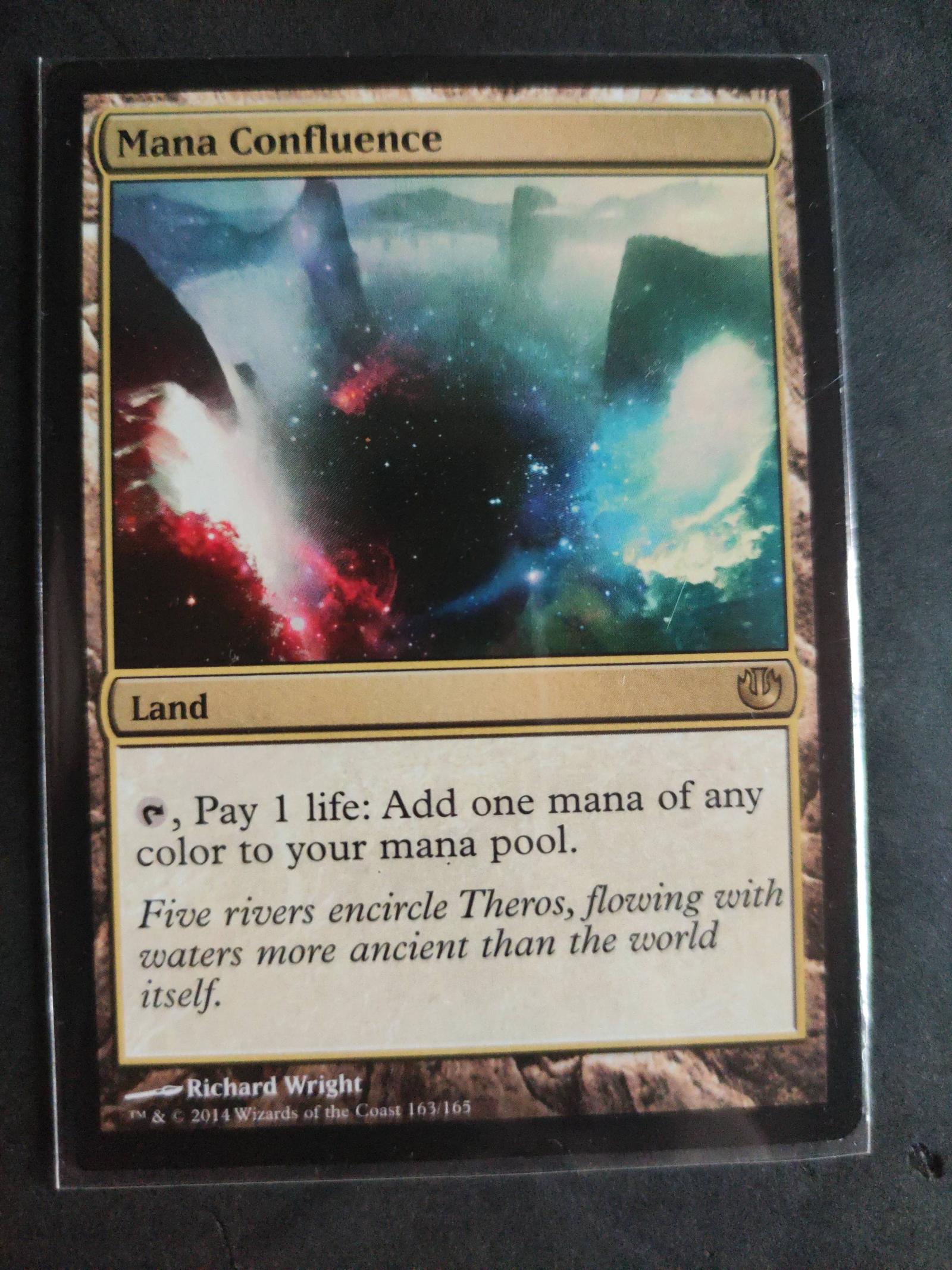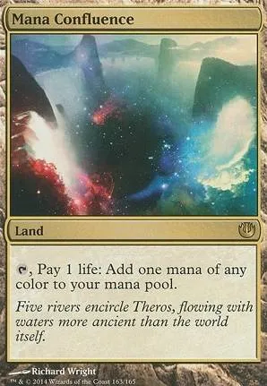 Mana Confluence is a land card from the Theros set, illustrated by Richard Wright. This card allows you to pay 1 life to add one mana of any color to your mana pool. It is a highly playable card in various Magic: The Gathering formats. Card number 163/165. Not foil.