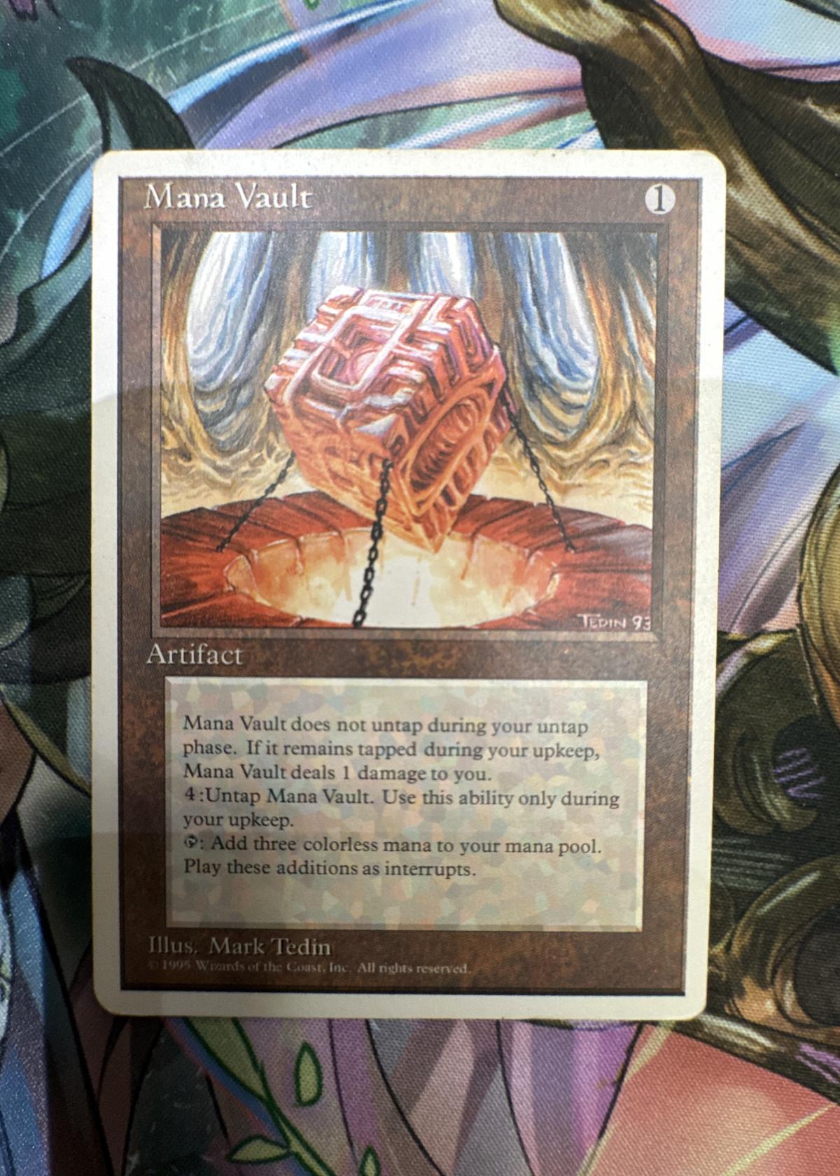 Mana Vault is a highly collectible Magic: The Gathering artifact card illustrated by Mark Tedin, from the original Revised Edition (3rd Edition) set. This card is not foil. Mana Vault is highly sought after for both playability in older formats (such as Commander and Vintage) and collectibility due to its age and historical value. Notably, the card is known for its powerful mana ramp ability, and holds a special place in Magic's early history.