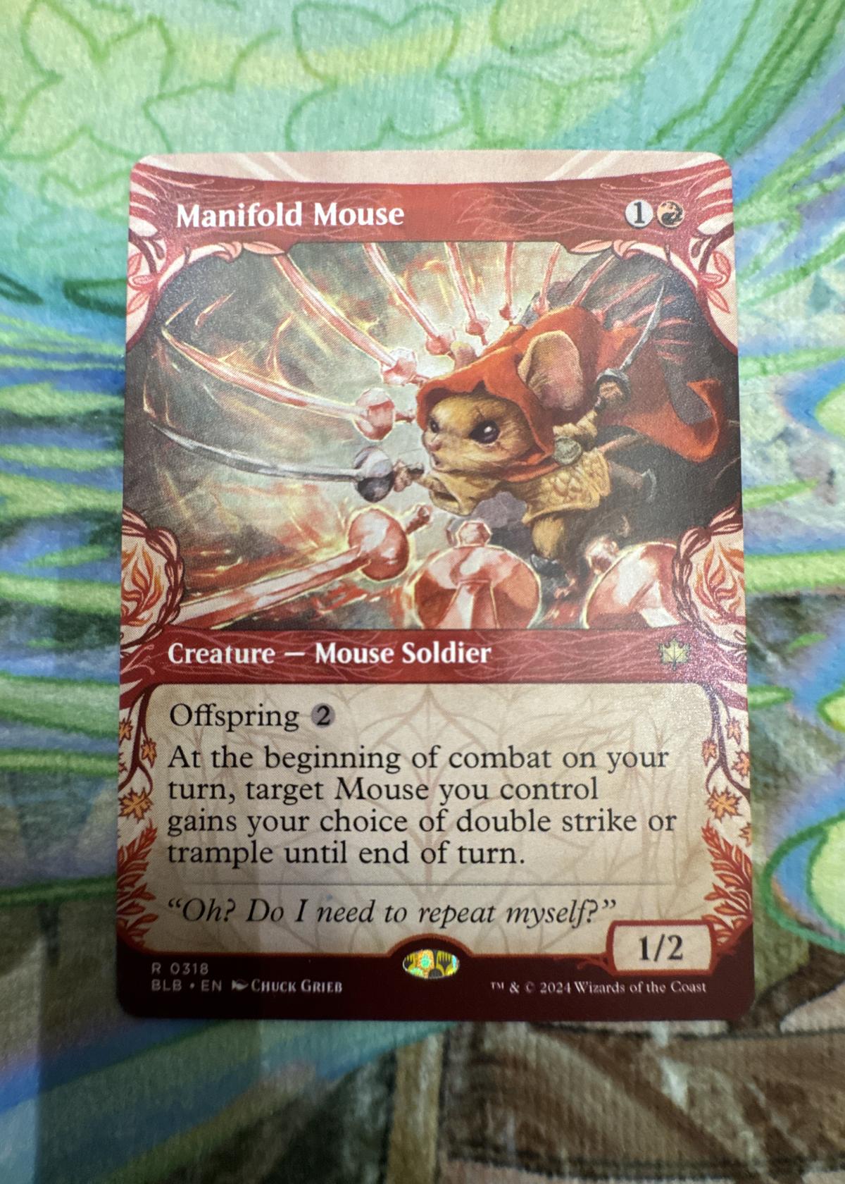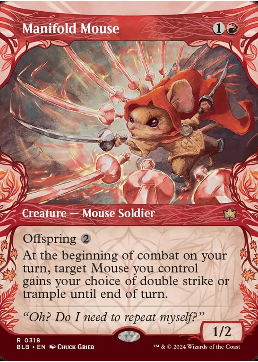 Manifold Mouse is a rare Magic: The Gathering card from the set 'Bloomburrow' (BLB), featuring artwork by Chuck Grieb. As a 'Creature — Mouse Soldier,' this card offers Offspring abilities and a powerful combat effect for Mouse decks. The card is printed in English and features a normal, non-foil treatment. It is mainly collectible, but could see play in thematic or casual meta decks built around the Mouse tribal archetype. Set number: 318.