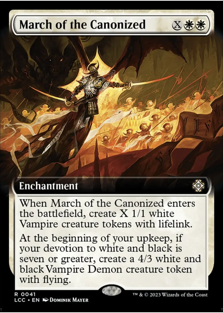 At the beginning of your upkeep, if your devotion to white and black is seven or greater, create a 4/3 white and black Vampire Demon creature token with flying.