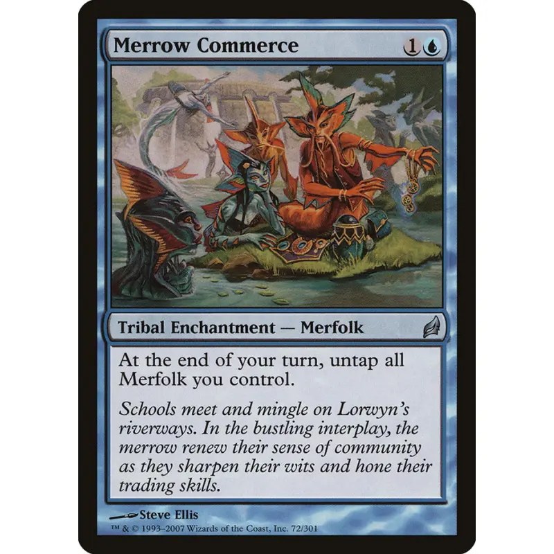 Merrow Commerce is a Tribal Enchantment - Merfolk from the Lorwyn set illustrated by Steve Ellis. This card allows you to untap all Merfolk you control at the end of your turn. It is a useful card in Merfolk tribal decks that sees play in casual and some competitive formats. Not a foil version.