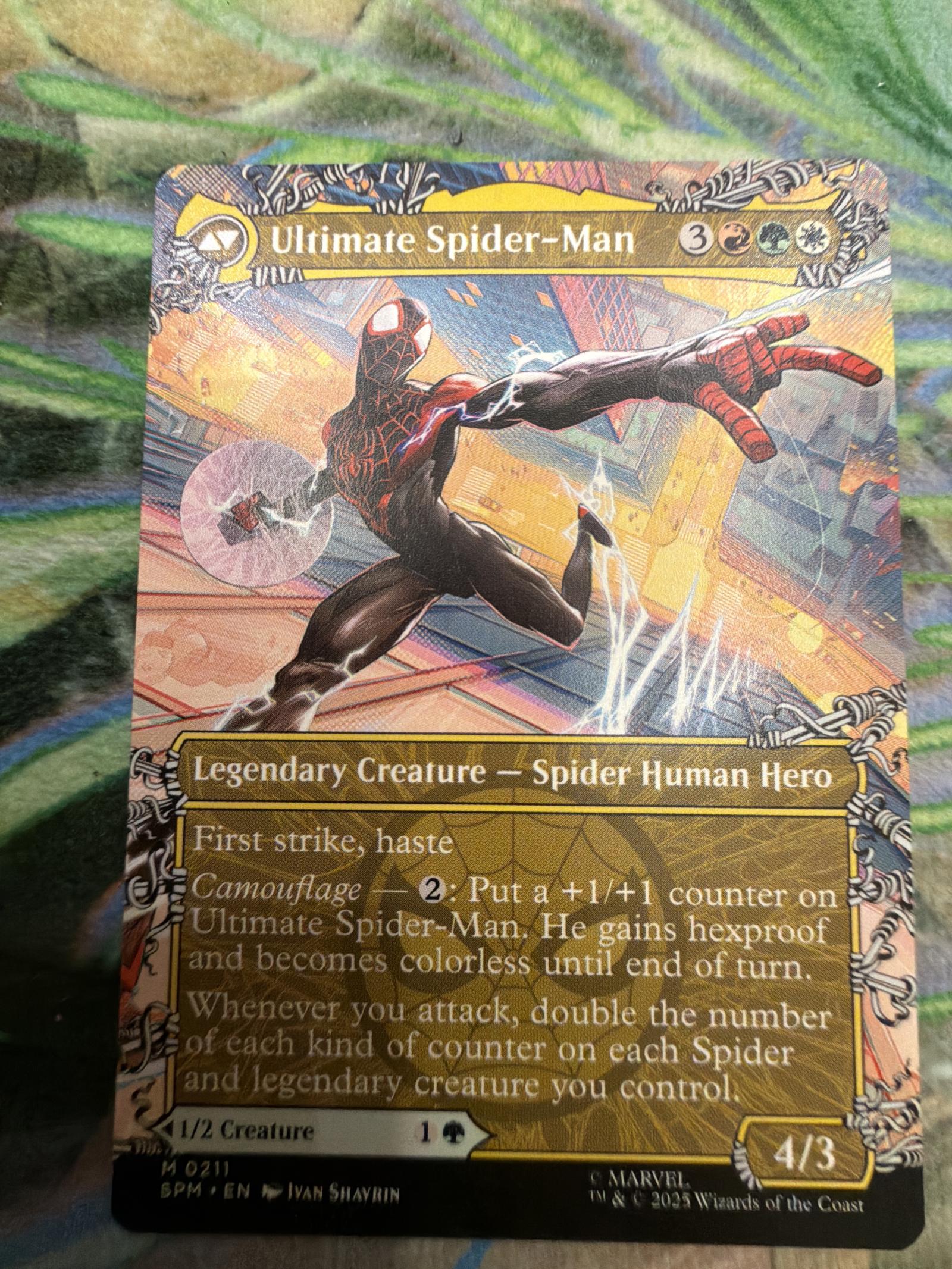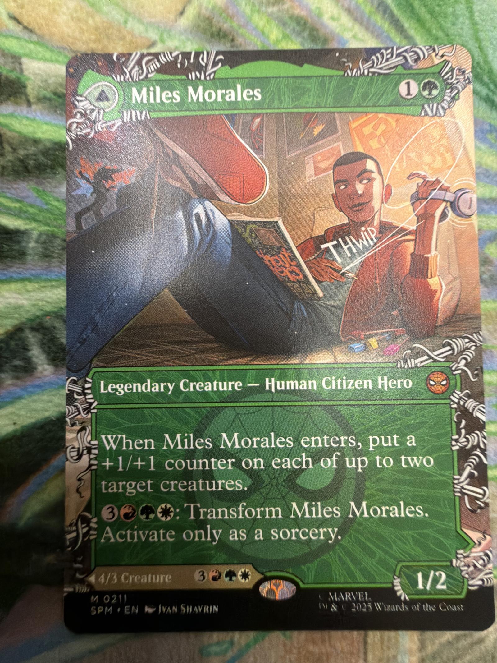 This is a two-faced Magic: The Gathering card featuring Miles Morales transforming into Ultimate Spider-Man. Art by Ivan Shavrin from the SPM Marvel set (2023). The card is playable in Commander and casual formats with interesting abilities like counters and first strike. The card is normal printing, English language.