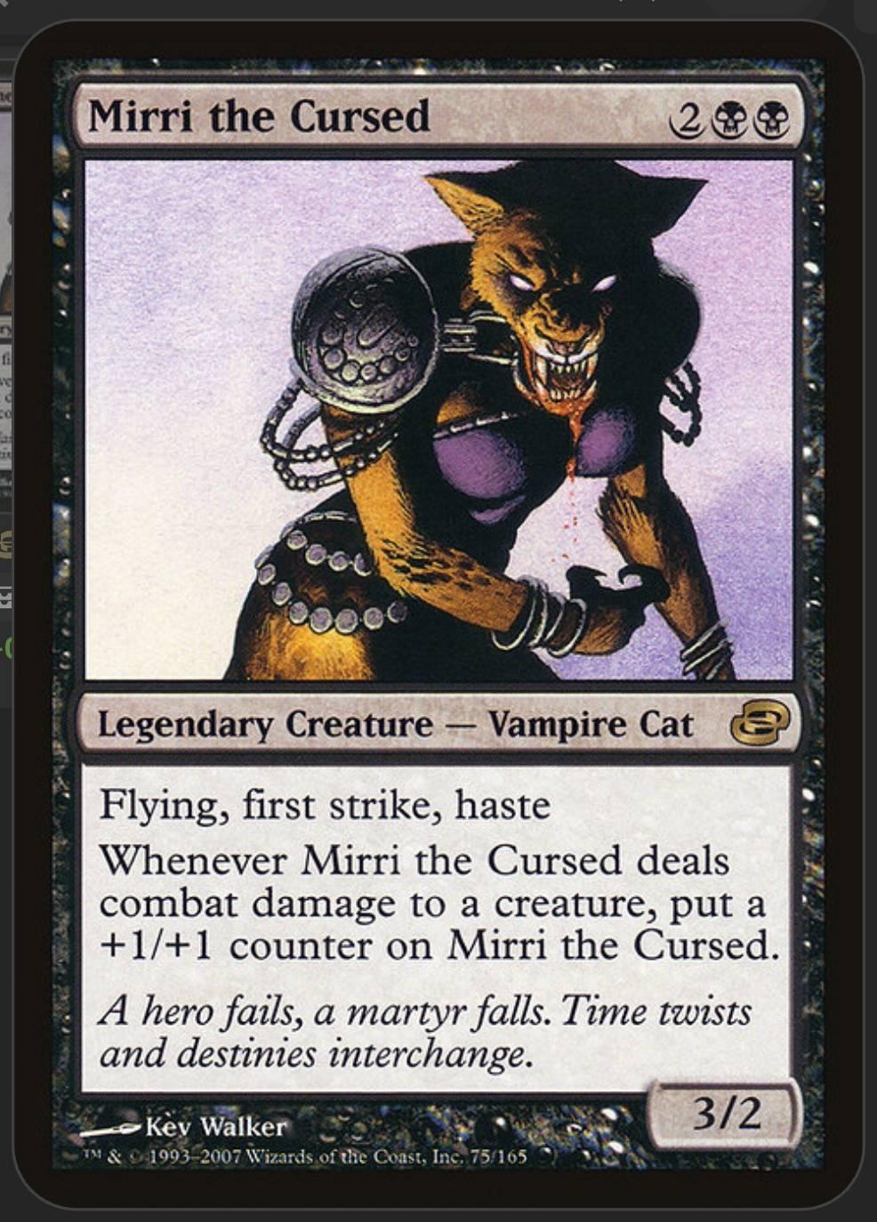 Mirri the Cursed is a legendary creature card from the Champions of Kamigawa set, illustrated by Kev Walker. It features flying, first strike, and haste abilities, and gains +1/+1 counters when dealing combat damage to creatures. Playable in various decks, this card is a notable collectible. This version is a normal (non-foil) printing in English.