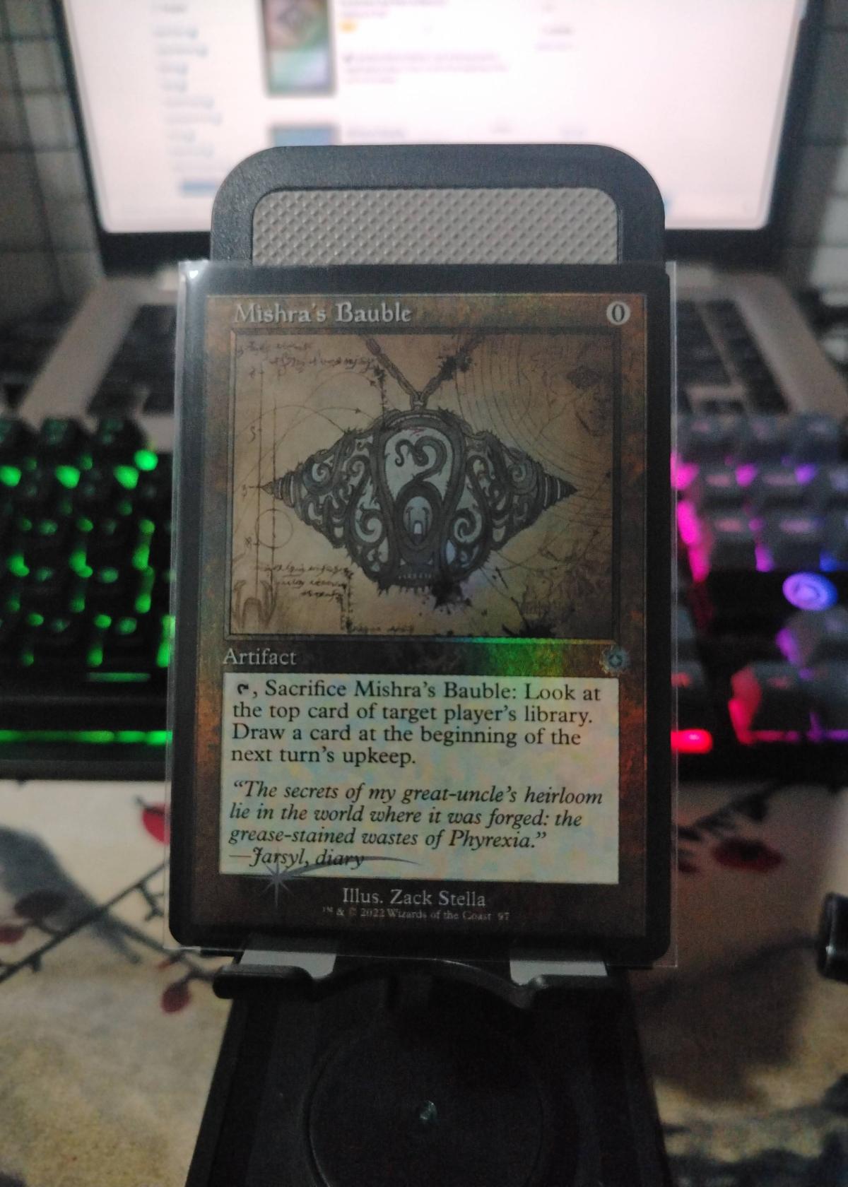 Mishra's Bauble is a popular Magic: The Gathering artifact card illustrated by Zack Stella. This version is from a 2022 set, as indicated at the bottom. Mishra's Bauble is a powerful and highly sought after card, often played in competitive Modern and Legacy formats due to its low mana cost and card-drawing ability. The card appears to be foil, enhancing its collectibility. The card text and set information can be seen clearly, making this a great addition for both players and collectors.