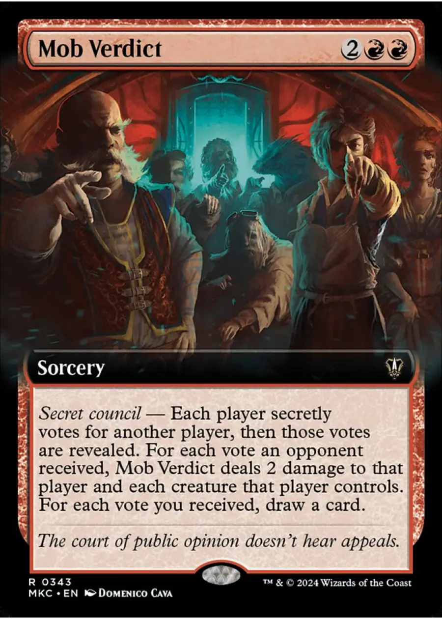 - Secret council — Each player secretly votes for another player, then those votes are revealed. For each vote an opponent received, Mob Verdict deals 2 damage to that player and each creature that player controls. For each vote you received, draw a card.