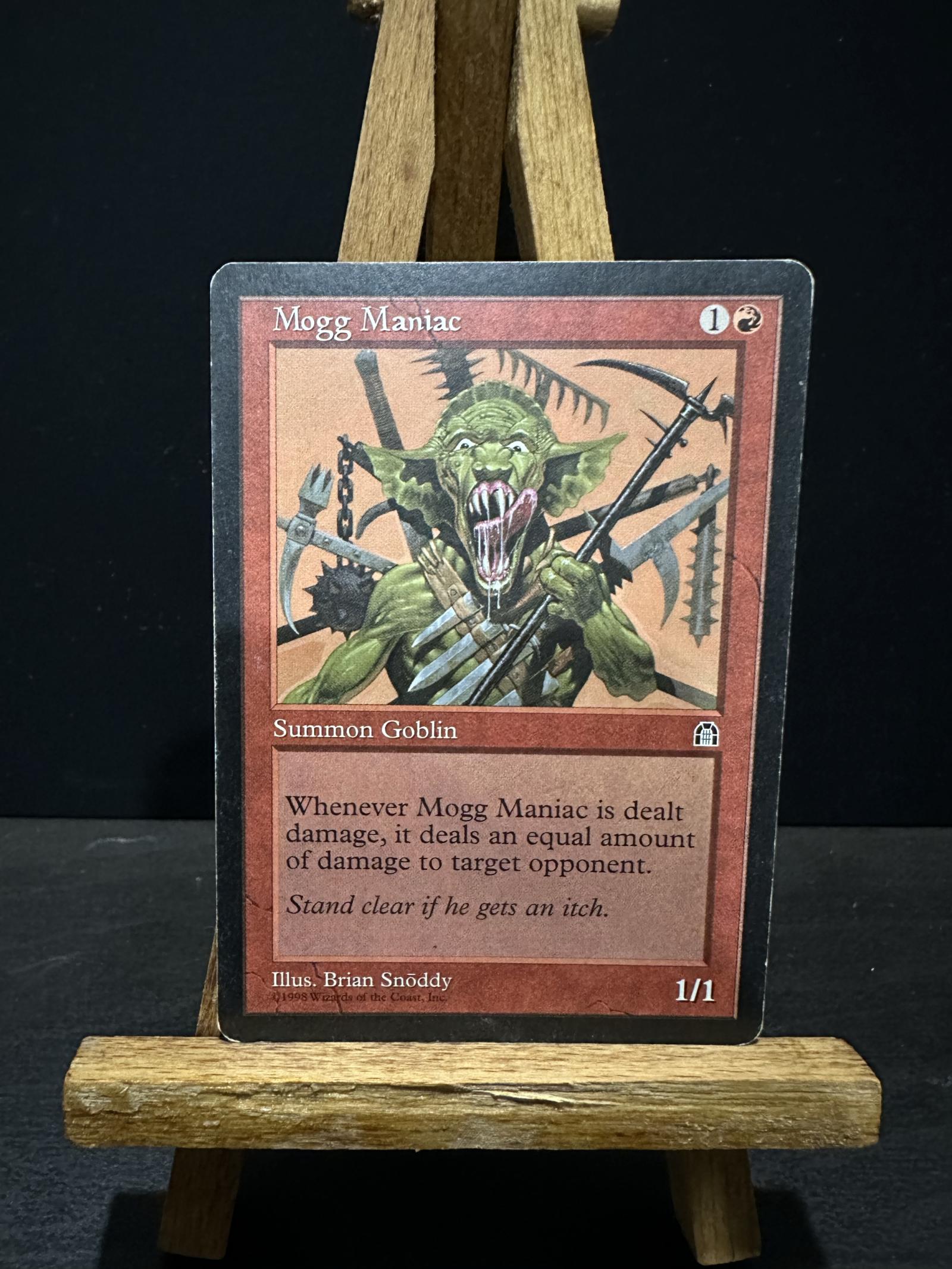 Mogg Maniac from the Alpha set, illustrated by Brian Snoddy. This is a red Goblin creature that deals damage to opponents whenever it is dealt damage. A classic collectible card from Magic: The Gathering's earliest set. The card is non-foil and playable in casual formats but not typically part of the current meta.