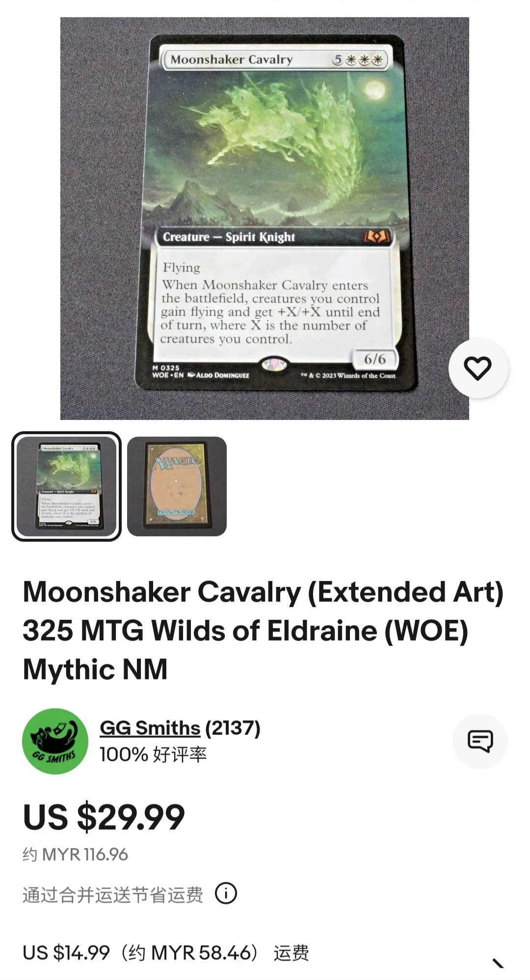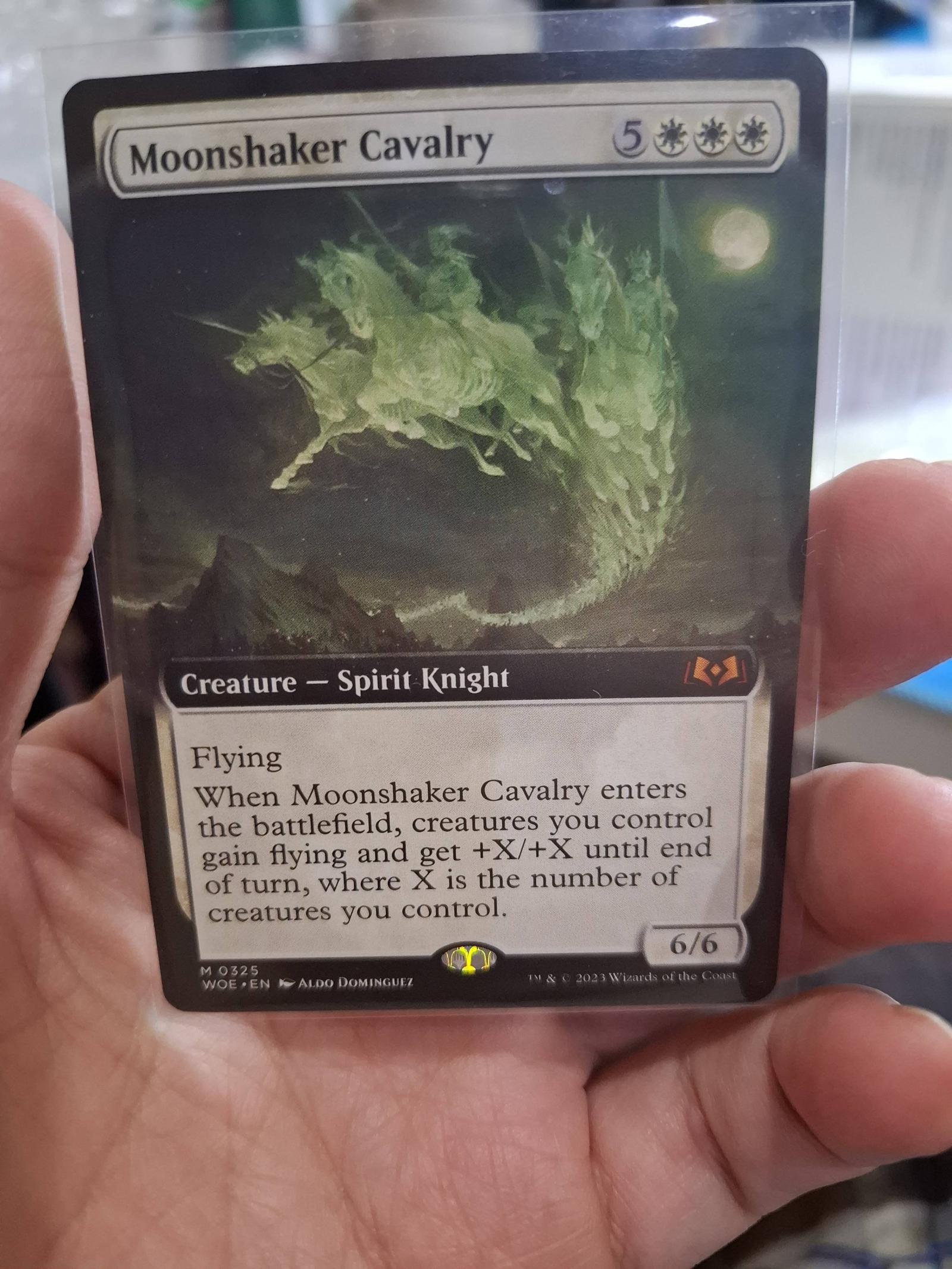 Moonshaker Cavalry from the Wilds of Eldraine (WOE) set is a Spirit Knight creature card with flying. When it enters the battlefield, creatures you control gain flying and get +X/+X until end of turn, where X is the number of creatures you control. Card number 325 features artwork by Aldo Dominguez. This card is a normal printing and playable in certain decks focusing on flying creatures and board presence.