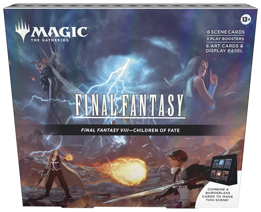 This Magic: The Gathering—FINAL FANTASY Scene Box Case has 4 scene boxes, one of each type. Every Scene Box contains 6 traditional foil borderless scene cards, 6 Art-Only scene cards, 3 Play Boosters, and a paper display easel. Each Play Booster contains 14 Magic: The Gathering cards, including 1–4 cards of rarity Rare or higher, 3–6 uncommon cards, 6–9 common cards, and 1 land card. One card of any rarity is traditional foil. The land card is also traditional foil in 20% of Play Boosters. This product does not contain a Golden Chocobo card (available in English-language Collector Boosters only).