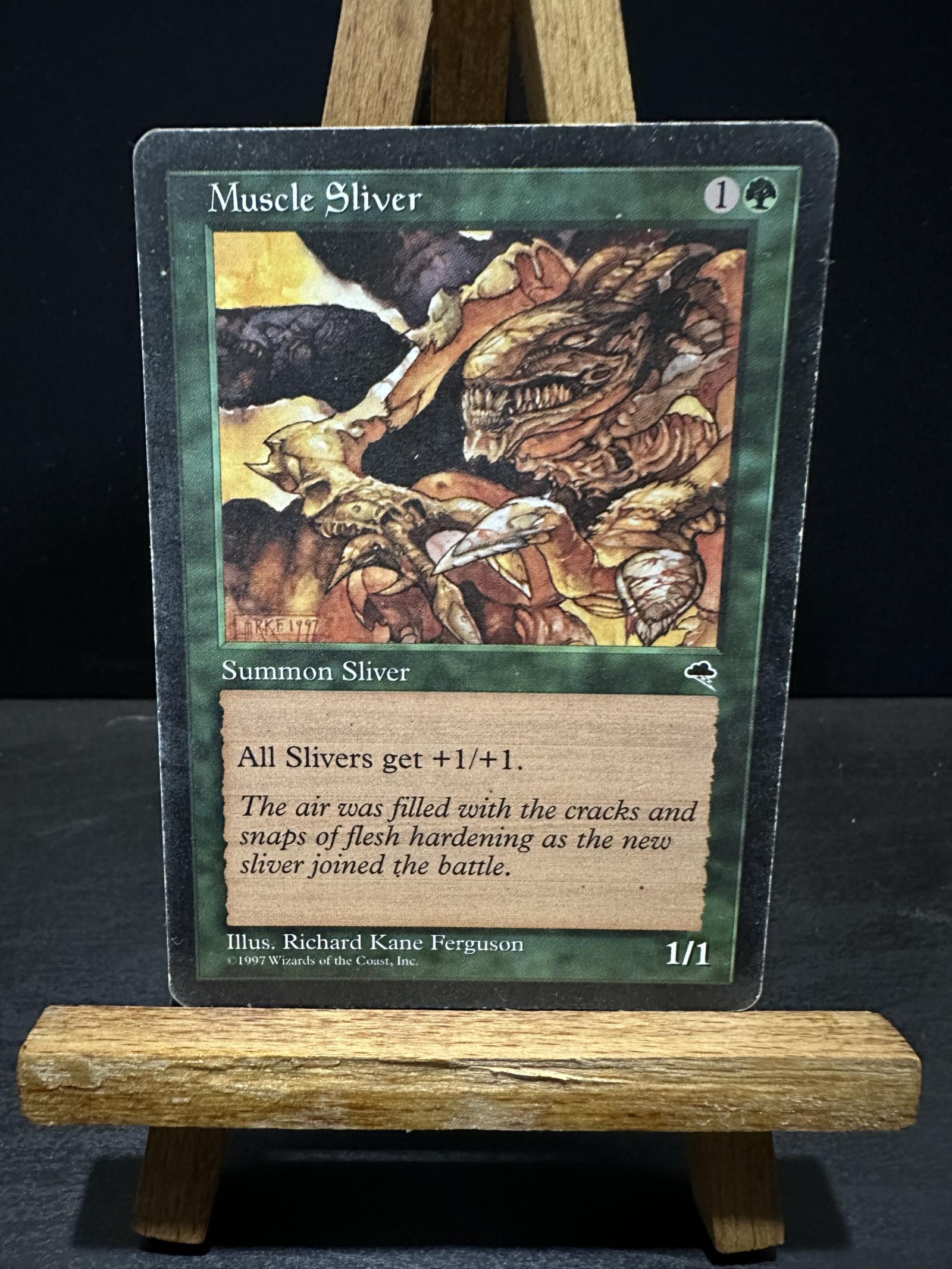 Muscle Sliver from the Alpha set, illustrated by Richard Kane Ferguson. This is a classic collectible card from Magic The Gathering's first set. It features the iconic ability to give all Slivers +1/+1, making it playable in Sliver tribal decks. The card is not foil.