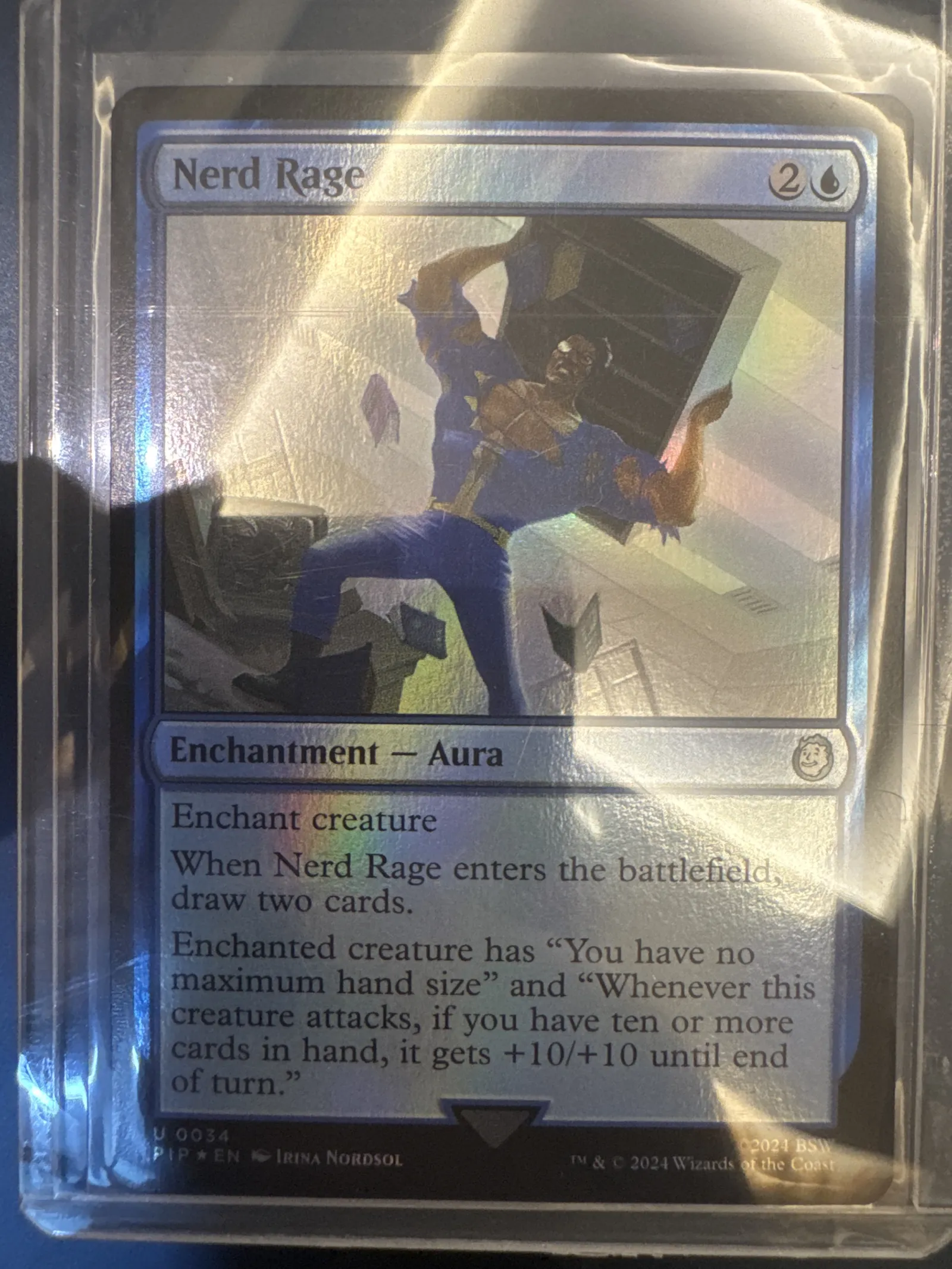 Nerd Rage foil card from the 2024 PIP set. Illustrated by Irina Nordsol. This is an enchantment aura that enchants a creature, allowing you to draw two cards upon entering the battlefield and giving the enchanted creature no maximum hand size and a potential +10/+10 boost if conditions are met. This card is playable in various Magic: The Gathering formats. Language: English.