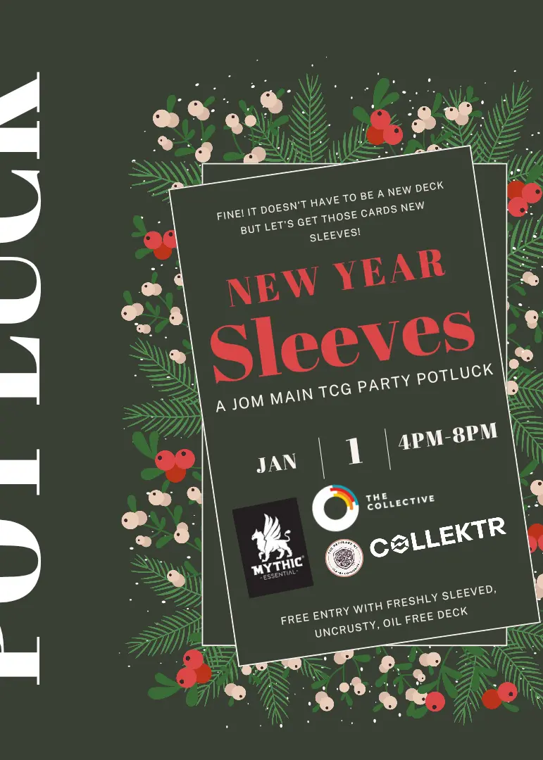 Join us for the New Year Sleeves: A Jom Main TCG Party Potluck to kick off 2025 in style! π Bring your decks, your favorite potluck dish, and get ready for a day filled with games, laughter, and epic battles!